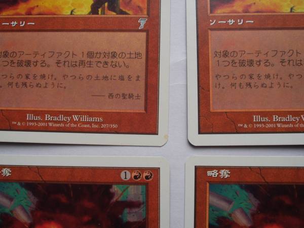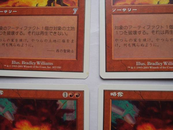 B知人の委託品です。 画像が全てです。 MTG 略奪 日本語4枚 何語だか分らない時があります。 エキスパンション、外国語(言葉)は画像で確認をお願いします。 カードはプレイしてます。 程度はカードに目立つ擦り傷、傷、シワ、折れ目、ペン跡のようなキズ、汚れ、角や端に傷、黒枠にキズ、などのキズが結構あります。 カードからタバコ、香水の匂いがします。 カードが丸まっていたり反ってたりしています。 気が付かない部分がありますので程度を気にする方は入札をご遠慮下さい。 程度はボロ、ジャンクです。 コレクションには向きません。 何か起きた場合には自分では対応が出来ませんのでご理解頂ける方のみ入札をお願いします。 普通郵便で発送します。 郵便事故や郵便破損が起きた場合には保障できません。 ノ-クレーム、ノーリターンでお願いします。 ●クロネコメール便は2015/3/31で発送が出来なくなりました。ご了承下さい。 (2016年 9月 28日 18時 44分 追加) 画像2枚目、3枚目の1枚のカードの白枠右下に目立つ茶色い汚れがあります。