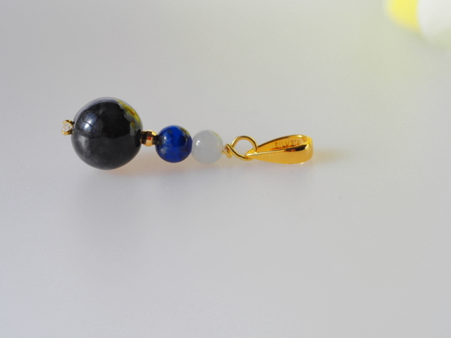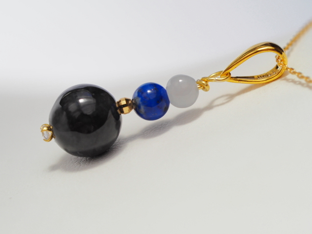 こちらは、8mmサイズのブラック翡翠(天然無処理)に3.5mmサイズの小珠ブルー翡翠(天然無処理)また、4mmサイズの鮮やかなブルーの天然ラピスを組合わせて、三種類石の濃淡カラーは、翡翠原石の個性をプラスして、魅力的なペンダントトップを仕上げております。