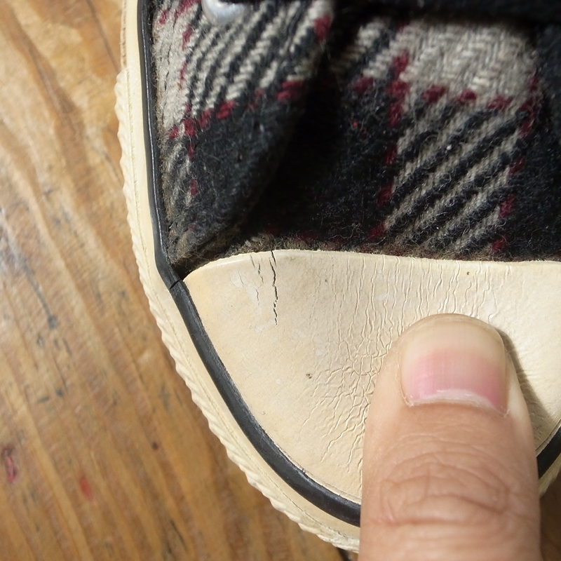 コンディションは、内側ヒール生地にダメージ。右側トゥにひび割れ。その他経年による使用感があります。