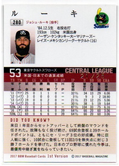 【ジョシュ・ルーキ(東京ヤクルトスワローズ)】2017 BBM 1st Version 赤箔サインパラレルカード [21/25]