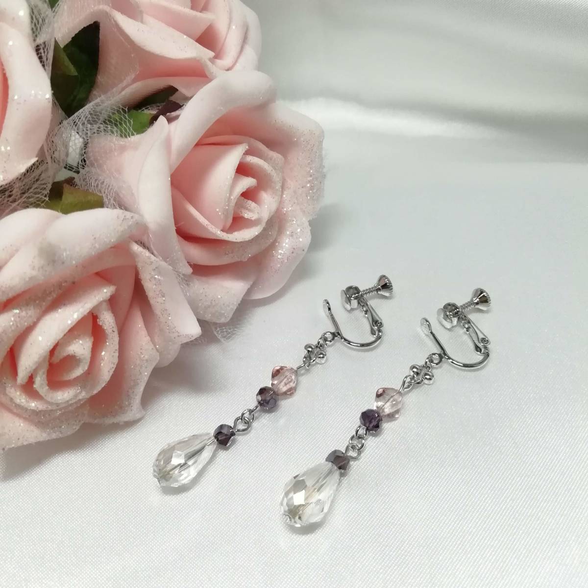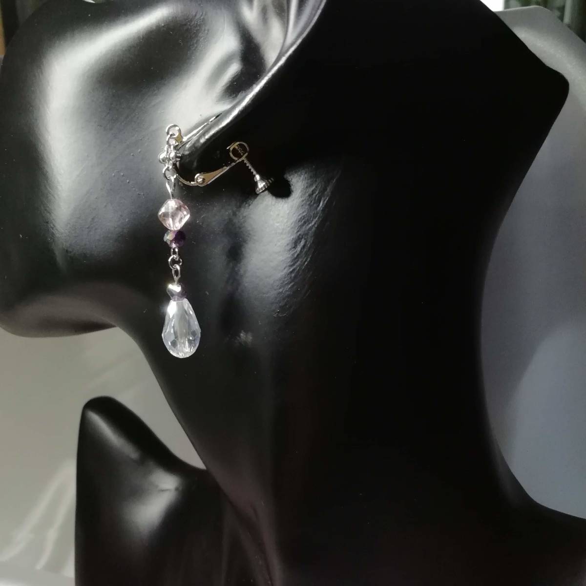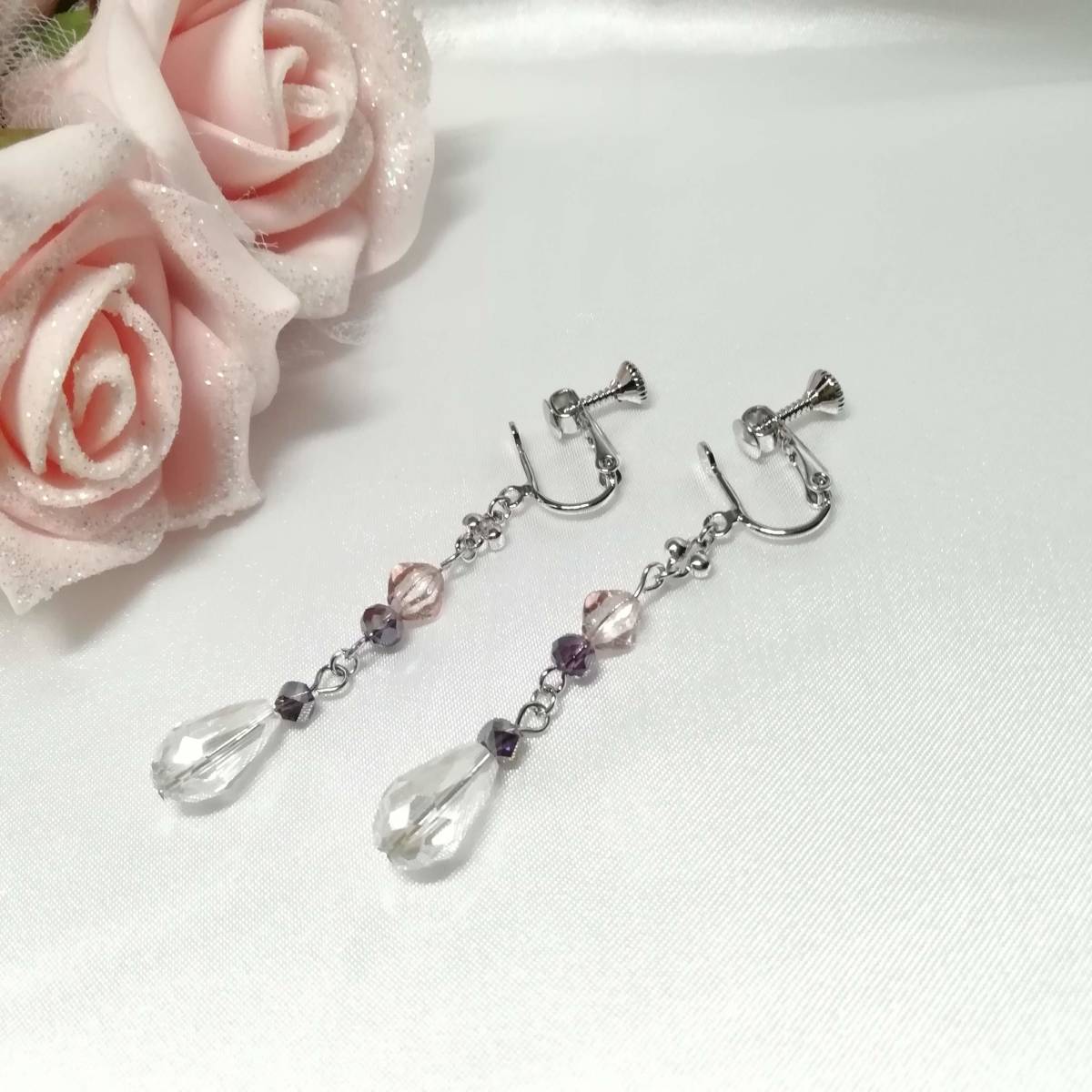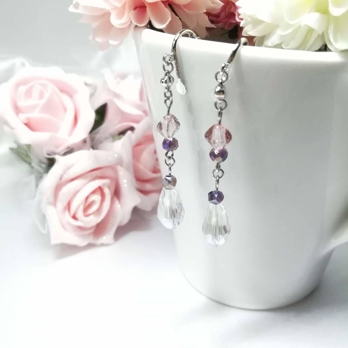 ★商品内容★ ★クリスタルしずくのハンドメイドイヤリング★バイオレット/チェコビーズ/シンプル/シルバー/上品/シック/ドロップ/バイコーン/クリスタル 優し色合いのビーズとシルバーの組み合わせが シックで上品な大人の女性らしさを印象付けます.・**。.・*・**。.・ クリスタルのガラスビーズが 動くたびにキラキラと光に反射してとても綺麗です.・**。.・*・**。.・ 普段使いはもちろん、オフィスにも、 お出掛けやお洒落のワンポイントにも最適です・**。・**。 【素材】 チェコビーズバイコーンピンクトパーズラスター(チェコ産)6mm ガラスビーズドロップクリスタル14mmx7mm ガラスビーズツイストバイオレット4mm ガラスビーズボタンカットバイオレット4mm ハンドメイドチェーンシルバー カンより垂れ下がる長さは、約4.5㎝です。 Eー419 ★商品状態★ ・画像と実物の色味が多少異なる場合があります。 ・緩衝材(プチプチ等)を使用し、防水梱包でお届け致します。 ★注意事項★ ***~ご購入前に必ずお読み下さい~*** ***商品について*** *一点一点心を込めて作っておりますが、手作りなため多少の歪み等あるかもしれません。 手作りの味わいと、世界で一つだけの作品とお考えいただければ幸いです。 *デリケートな商品ですので、強く引っ張ったりすると破損する事もあります。 お取り扱いにはご注意ください。 *写真も完璧な色合いの表現にはなっていない場合もあります。 *基本イヤリング金具は跳ね上げ式ネジ付きを使って作成しています。 ご希望によりピアスへの変更も承っております【フックピアスへの変更(無料)/ キャッチピアスへの変更(別途追加料金 120円)】 ~ご注文の際にメッセージ欄よりお申し付けください~ 尚、金具変更のご希望が無い場合は、掲載された写真の金具にてお送り致します。 *金属アレルギーへの対応はしておりませんので、ご心配な方はご遠慮下さいますようお願い致します。 *永くご愛用頂くために、ご使用後は柔らかい布等で軽く拭いてください。 ***ご質問について*** *ご購入前にお願い致します。 日中は仕事をしておりますので、ご返事が直ぐに出来ない場合がございます。 出来る限り早い対応を心がけますが、ご了承ください。 また、発送までには、お振込み確認後、翌日の発送を心がけておりますが、仕事の都合により2~3日程かかる場合がございます。(その際にはナビにてご連絡いたします) お急ぎの場合は、極力対応いたしますが、場合によっては対応致しかねる事もあります。ご了承下さいませ。 落札後4日以内にお手続き、ご連絡が無い場合は落札者都合で削除致します。 発送日指定・ご入金の予定が1週間以上先をお考えの方は、入札の前に質問よりご連絡くださいませ。 予めご了承の上、ノークレーム・ノーリターンでお願い致します。 | |||
