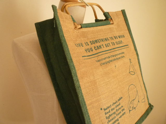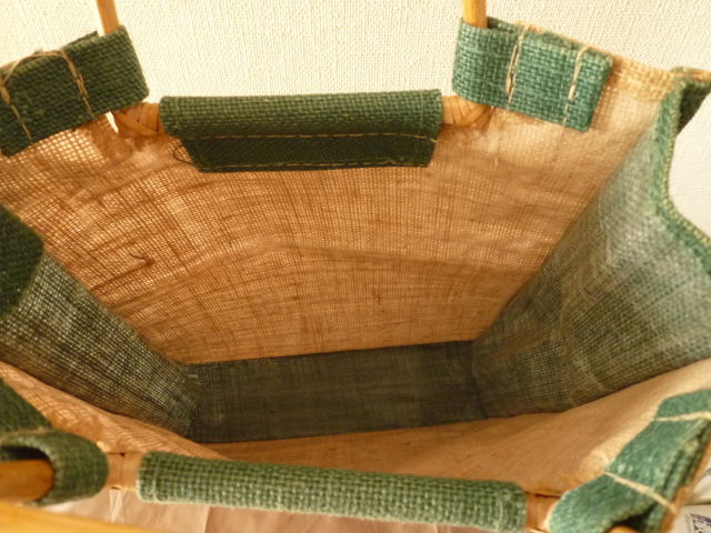 即決 美品ジュートトートバッグA4可マイバッグ手提げハンド軽量ベージュナチュラル系雑貨小物入れ春夏麻袋 木製ハンドルインテリア収納緑
