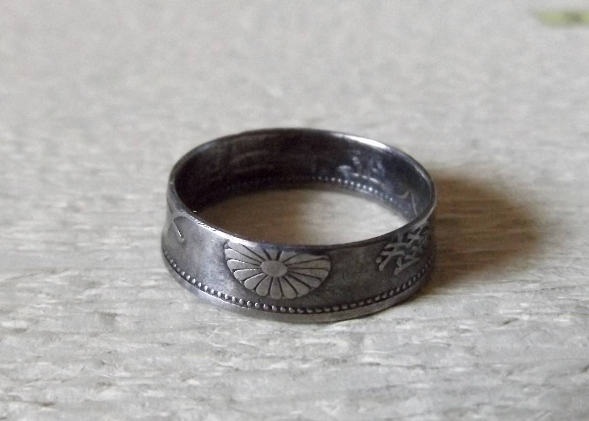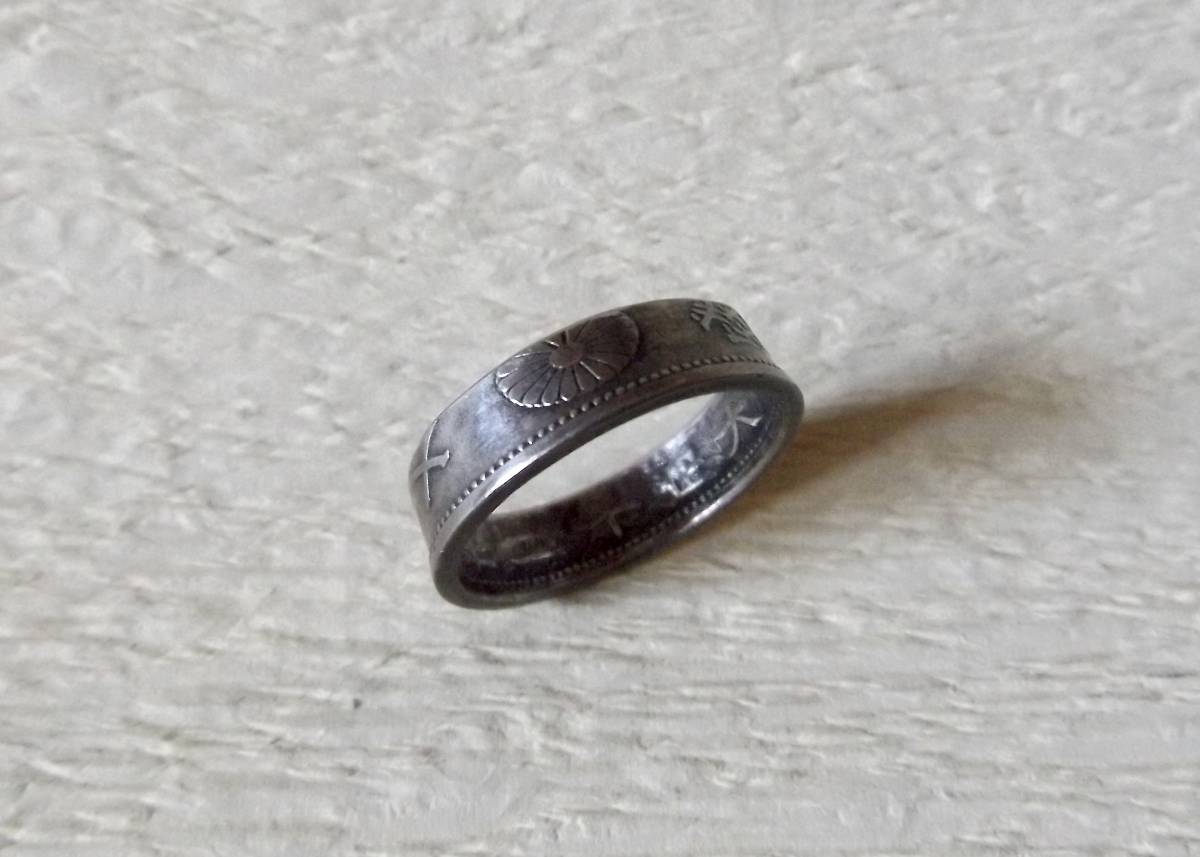 この商品は、大正12年発行の10銭白銅貨を使用し、銅貨に穴を明け木槌で叩いてリングに成形した1点ものです。