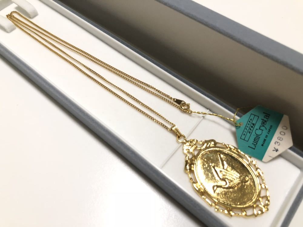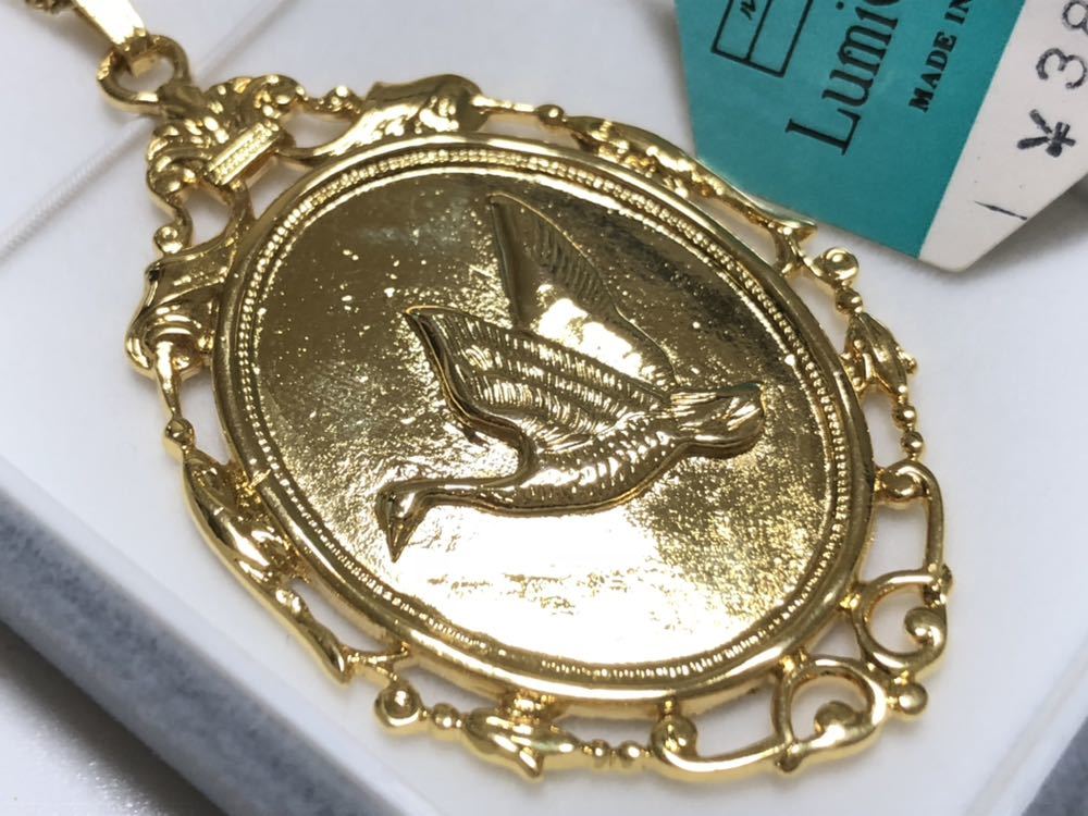 ルミクリスタルのゴールドカラーの浮き彫りで鳥細工を施した、ロングペンダントネックレスです。未使用、美品です。