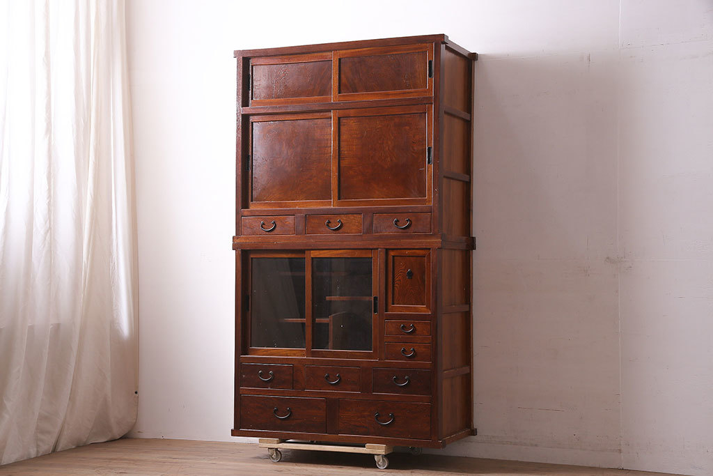 和製アンティーク 前面ケヤキ材 力強い杢目が魅力的な関東水屋箪笥(重ね箪笥、収納棚、キャビネット)(R-046968)