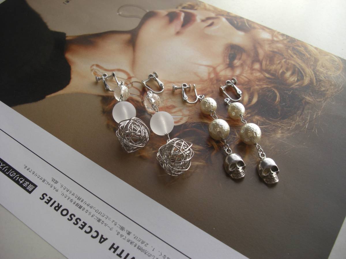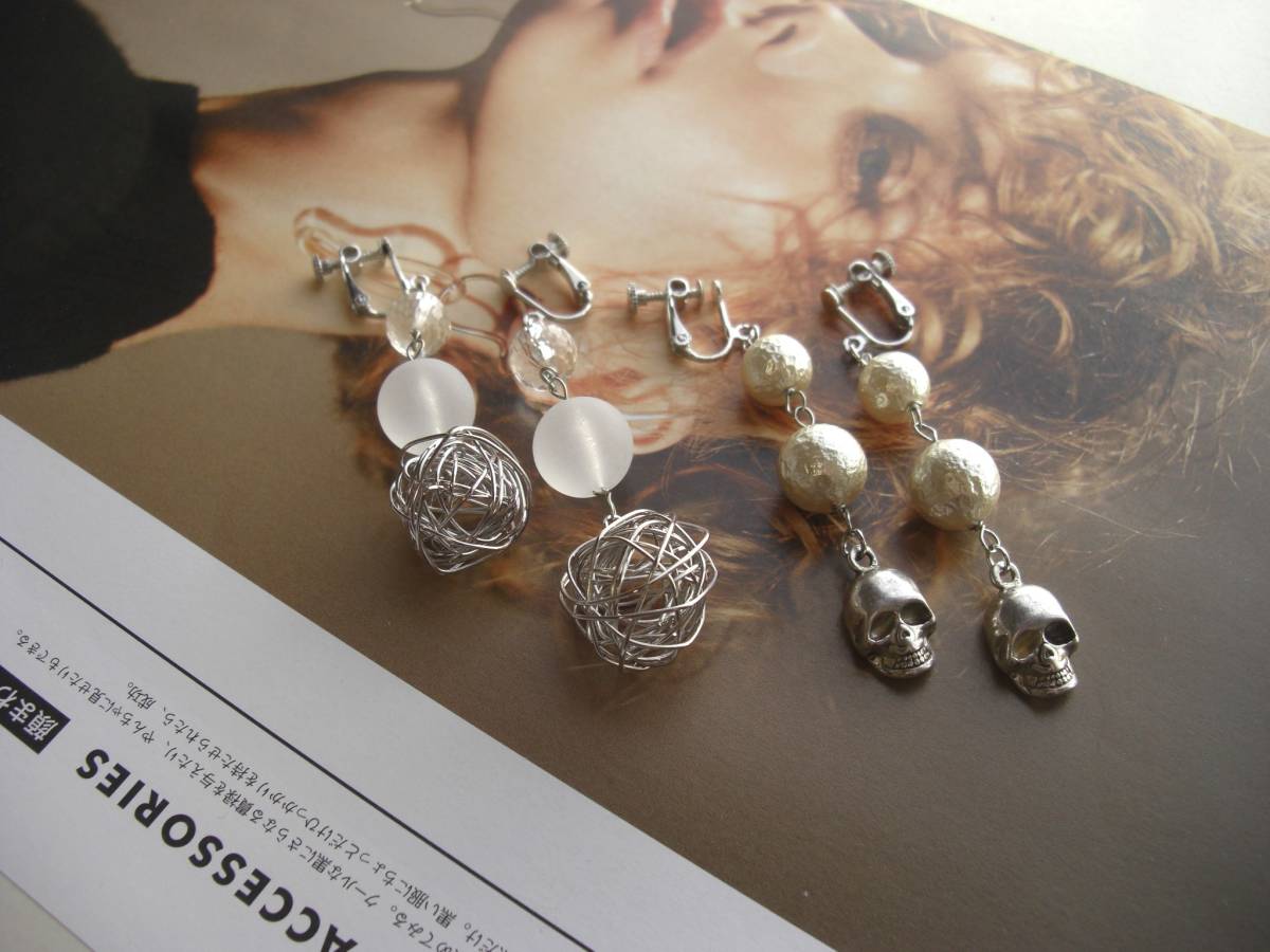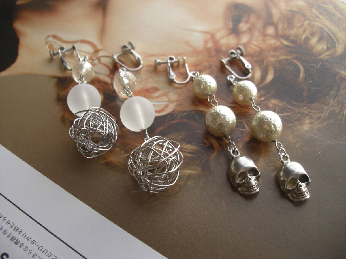パンクと女の子・・シリーズです♪やさしい白と髑髏さん・・ふんわりやさしいコットン・パールに樹脂ビーズやワイヤーボールや髑髏さんを合わせて個性的なイヤリング2点セットです♪デザイン違いのペア2組セットです♪白やオフホワイトでまとめてロマンチックな表情です♪左側のイヤリングは18ミリのワイヤーボールにフロストホワイトの樹脂ビーズ、透明なビーズを合わせて長さは8センチ位です♪右側は10ミリ、12ミリのコットンパールに髑髏さんを合わせて7・6センチ位です♪それぞれピアスに変更出来ます♪お揃いのネックレスやブレスレットも出品しています♪シンプルで飽きのこないいつまでも着けられるデザインを 考えて作りました!ハンドメイドをご理解頂いてノークレーム、ノーリターンでお願いします