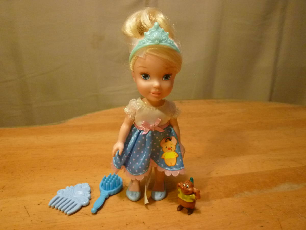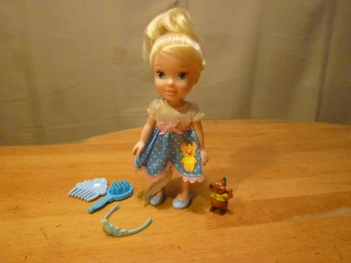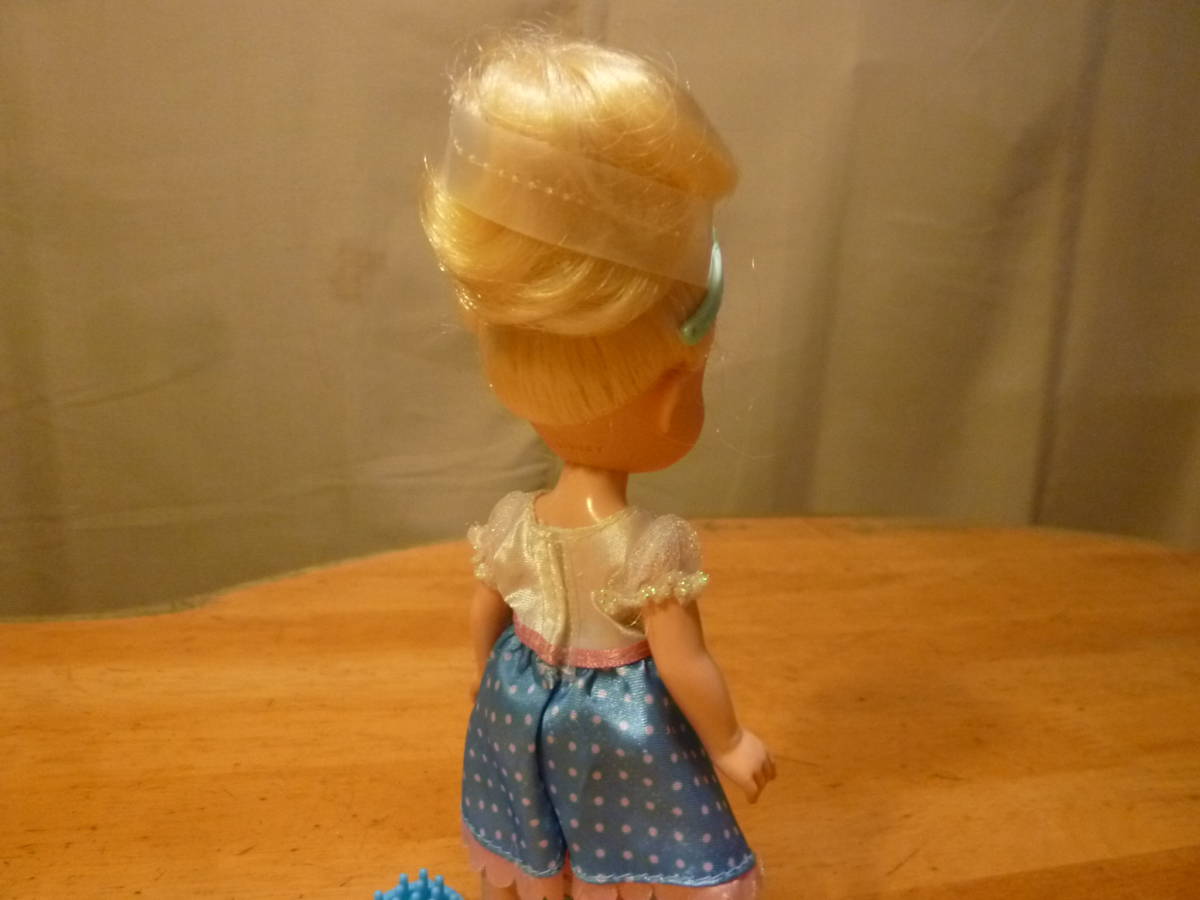 こちらは女の子が大好きなディズニーで、小さい頃のシンデレラ?とネズミの様ですがはっきりしません。当初からの着色付き下着で、長い髪をポニーテール?に渦巻き状にしてあり、その固定用だと思いますがプラ製のテープの様なものが付いていて、ネズミとティアラやクシとブラシがセットになっています。お洋服や靴は脱ぎ着が出来ますが、当初の内容等ははっきりしません。