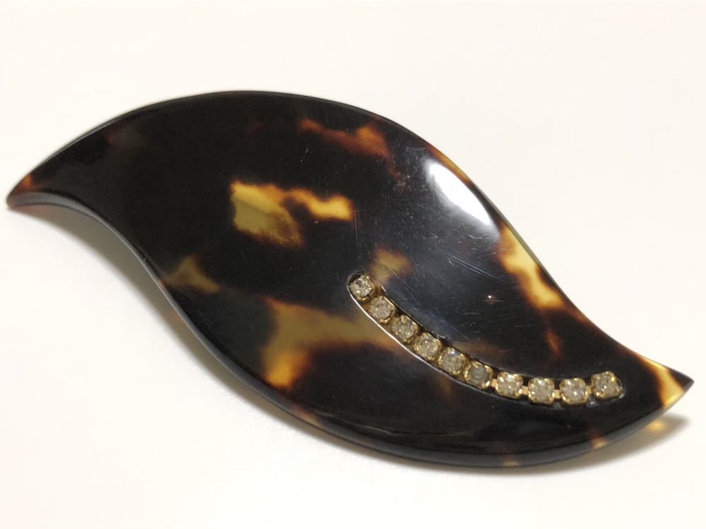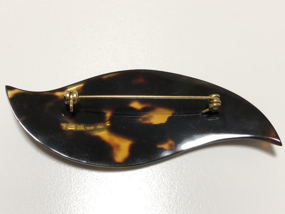 本鼈甲、ジルコニアを使用した、リーフデザインのブローチです。鼈甲部分に欠けや虫食いはありません。