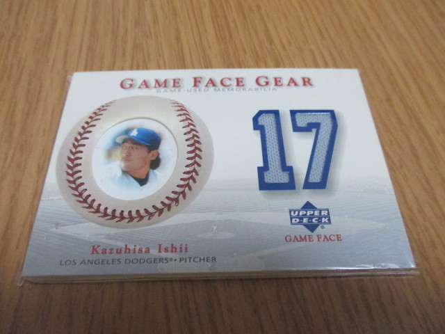 日本やメジャーリーグでピッチャーとして活躍して現在、楽天イーグルスのGMの石井一久のメジャーリーグ・ドジャース所属時代のアウェーゲームで使用したジャージの一部がインサートされたカードです。