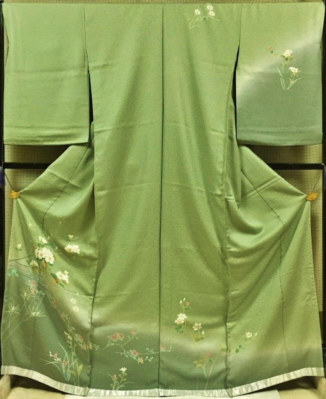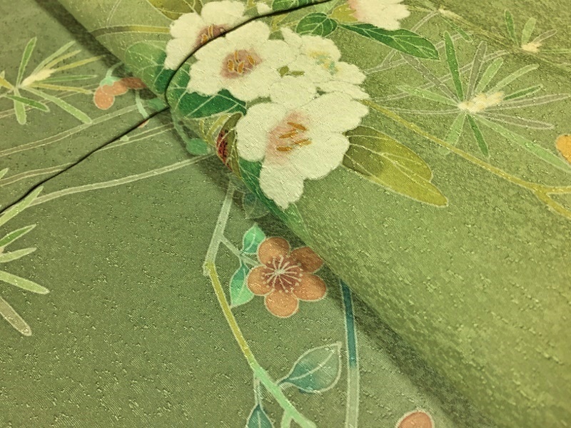 | 八掛けは、丹後一越縮緬地の共色(花柄入)が付いています。 | ||