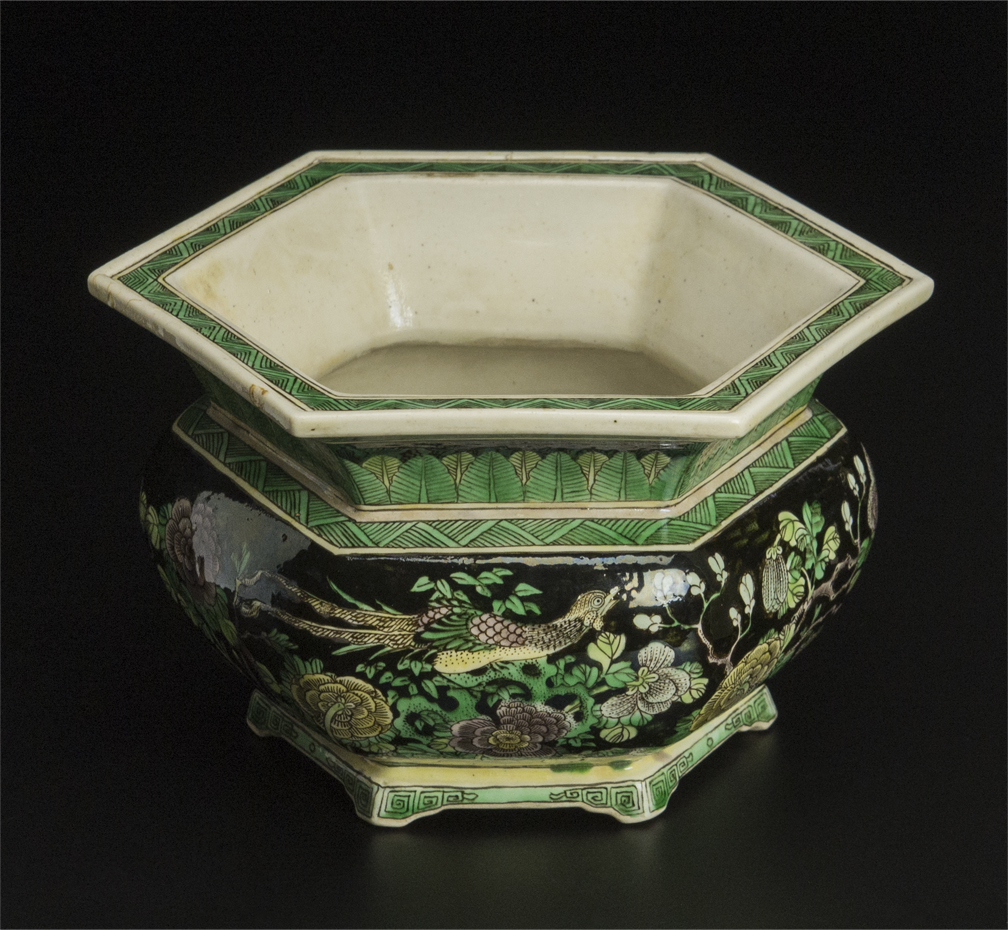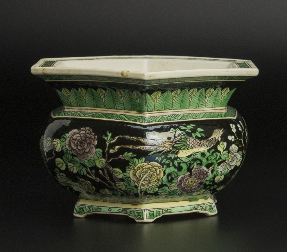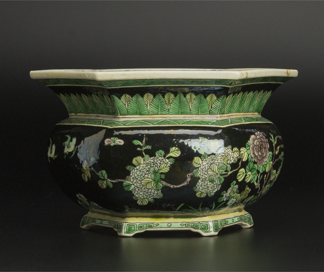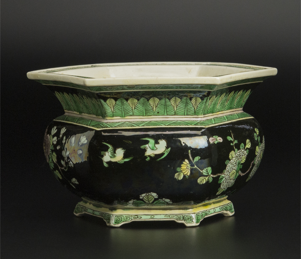 清 墨地五彩花鳥紋六稜盆 中国 古美術