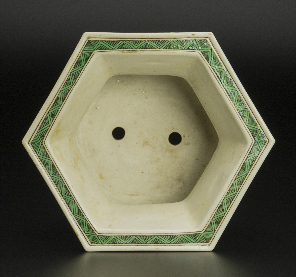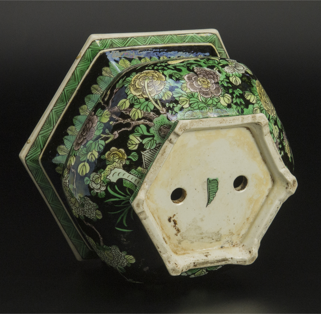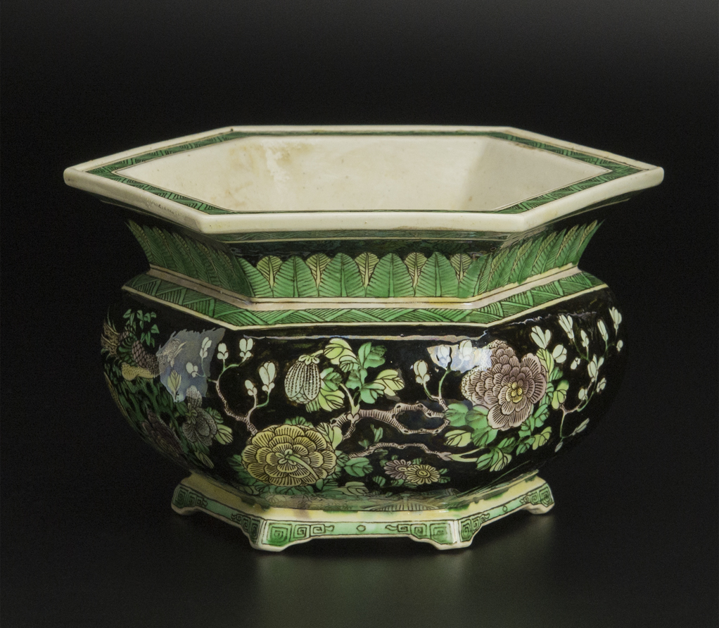 清 墨地五彩花鳥紋六稜盆 中国 古美術