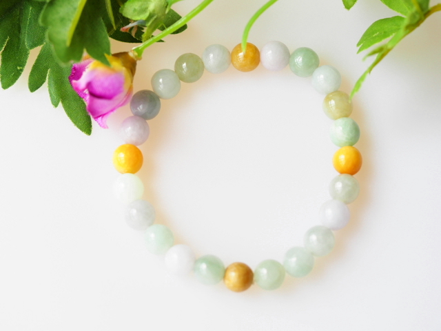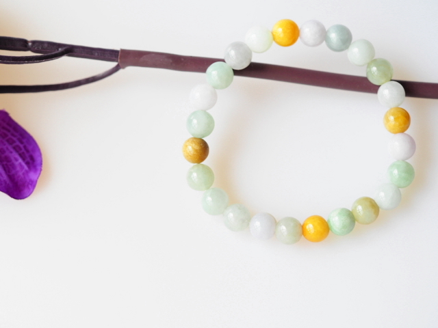 こちらは、マルチカラーの色合いで、肌馴染みも良い色を持つ翡翠のブレスレットです。
