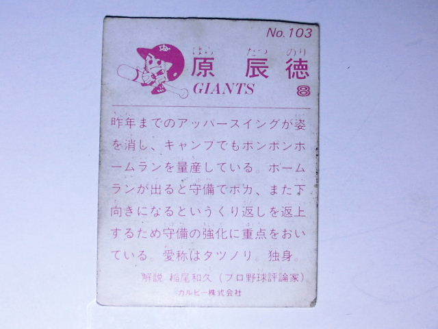 カルビー 83年 No.103 原辰徳 巨人 ジャイアンツ プロ野球 カード 1983年です。状態は中古品ですので劣化はありますので完品をお求めの方や細かいところが気になる方はご遠慮くださいませ。お送りするのは写真に写っている物がすべてです。発送料金は62円(ミニレター)を予定しています。どうぞよろしくお願いいたします。