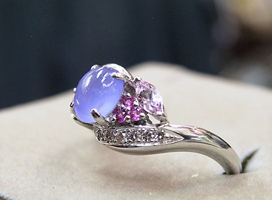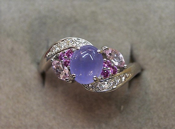 ♪通常は、淡い【パープル・カラー】ですが、太陽の紫外線を当てると、濃いパープル・カラーに変色する事で、有名な【ハックマナイト:hackmanite】(ソーダライト)・0.89c・カボションカット1石】を、【Pt900】リング枠の中央に留め、その脇には、【天然ダイヤモンド:0.13c】【天然ピンクサファイア:6石】【天然ピンクトパーズ:2石・マーキーズカット】を留め、ハックマナイトを引き立てています。淡い紫色の主石を、2種類のピンク石が囲んだ、オシャレで個性的な指輪です。この機会に、希少・レア・貴重な【ハックマナイト】をコレクションにお加え下さい。