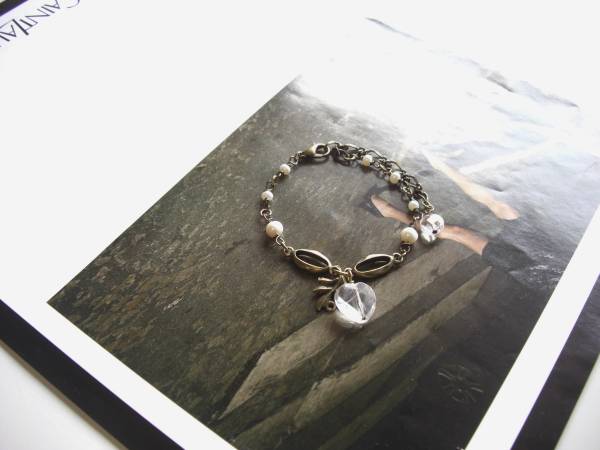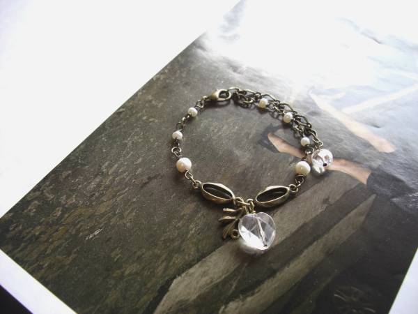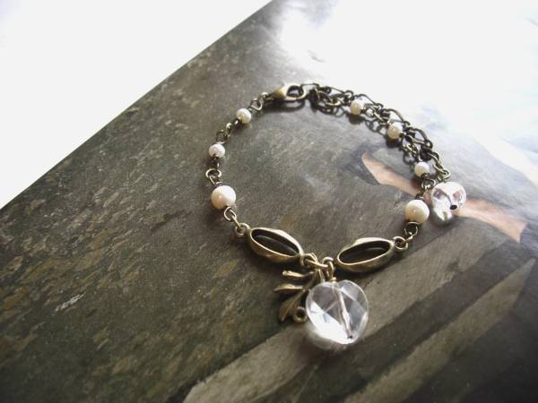 個性と自由・・シリーズです♪ヒロインの条件・・可憐な淡水パールと水晶のブレスレットです♪♪3ミリから5ミリ位までの淡水パール、12ミリのハートカッ トの水晶に葉っぱやリングのデザイン チャームを合わせてロマンチックな表情です♪長さは全長23センチ位で調節自由です♪お揃いのネックレスも出品して います♪ハンドメイドをご理解頂いてノークレーム、ノーリターンでお願いします