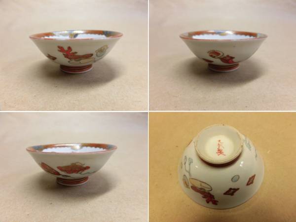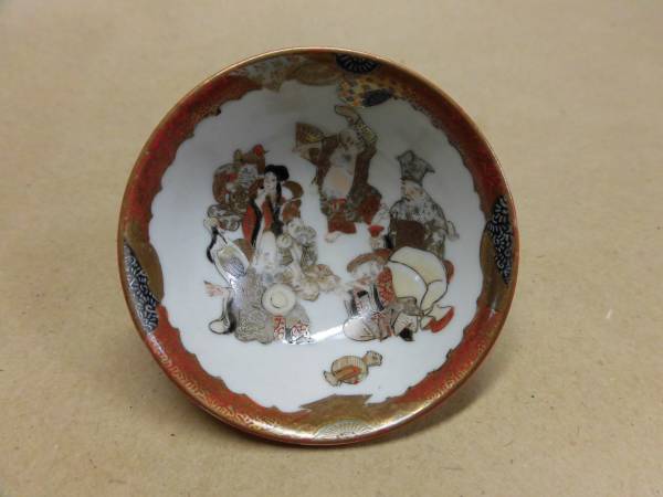 明治期の九谷です。盃の中は七福神の宴会図、外は宝づくしです。高台内に九谷製の銘があります。口径6.8×底2.7×高3センチです。キズはありません。