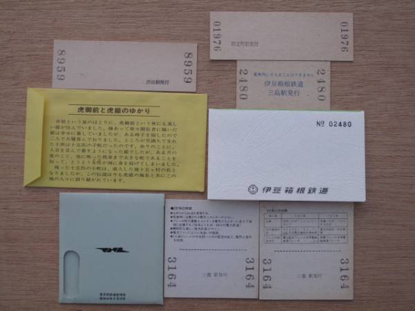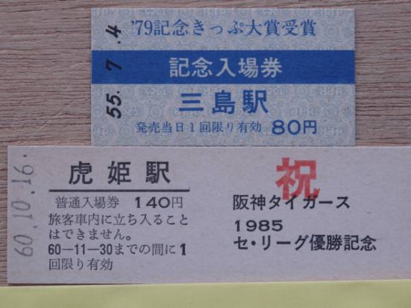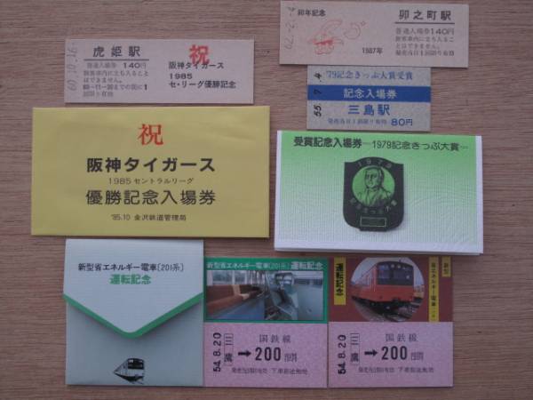 昭和54年から同62年に発行された、国鉄 伊豆箱根鉄道 各種 記念硬券 4種5枚 です。 ① 昭和54年8月20日に発行された、国鉄 新型省エネルギー電車 201系運転 記念硬券です。東京西鉄道管理局発行。電車のカラー写真が使われています。三鷹駅からの200円区間券2枚が袋に入っています。裏面に説明文。 ② 昭和55年7月4日に発行された、伊豆箱根鉄道 1979 記念きっぷ大賞受賞 記念入場券です。三島駅の80円入場券(記念硬券)が袋に入っています。 ③ 昭和60年10月16日に発行された、祝 阪神タイガース 優勝 記念入場券です。金沢鉄道管理局発行。虎姫駅の記念入場券(記念硬券)が袋に入っています。袋裏面に説明文。 ④ 昭和62年2月4日に発行された、卯年 記念入場券です。予讃線 卯之町駅の140円入場券(記念硬券)1枚。 サイズは①の袋がタテ6.7cm×ヨコ6.4cm、②の袋が5.5cm×9.5cm、③の袋が6.0cm×11.0cm、④が3.0cm×8.8cm。 いずれも美品です。 定形郵便110円でお送りします。 ★保存状態の記述は、あくまで出品者の主観的な評価ですので、保存状態にきびしい方は、入札をご遠慮願います。