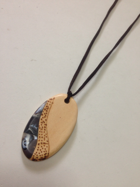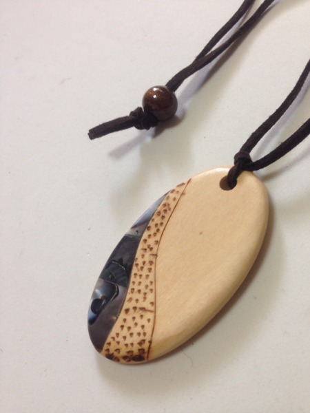 木製のシェルのペンダントネックレスです、トップのサイズは63×33センチです、長さはフリーに使えます