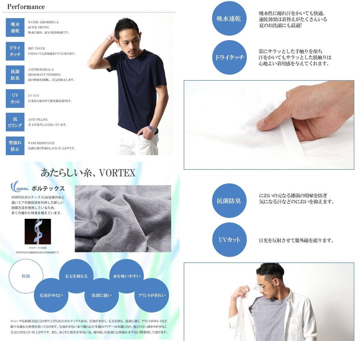 1.UVカット 2.防汚効果 3.抗ピリング加工 4.吸水速乾機能 5.ドライタッチ 6.抗菌防臭