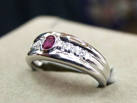 ♪きれいな、ピジョンブラッド・赤色の上質【天然:ルビー】のリングをどうぞ!【K18WG】製のリングの中央に、爪では無く、伏せこみと言う、高度な技術でルビーを留めています。爪留めでは無いので、洋服などに引っ掛かる事も無く、安心で付けやすいリングです。主石:ルビーの両側にも、上質で輝きの良い【天然ダイヤモンド:0.10c】が埋め込まれて、主石を引き立てています。引っ掛かり無し、腰の低い、頑丈な造り、シンプル・上品・センスの良いデザインは、年齢を問わず、どなたにもお似合いになります。ご自分へのご褒美に、プレゼントに、7月生まれの方に、ぜひ、どうぞ!現状サイズ【12号】注意:、デザイン上、サイズ直しはお受けしていませんが、将来に、指のサイズが変わった時には、デザインの一部が変わっても良ければ、前後2号位は、直せますので、ご安心下さい。