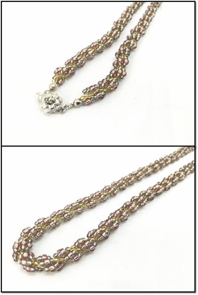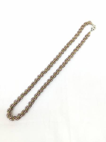 シャンパンゴールド・ピンク・シルバーの上品な色合いのビーズが三つ巴のように折り重なって1本のネックレスになっています。 留め金部分もしっかりしており高級感があります。程よい太さで素敵です。