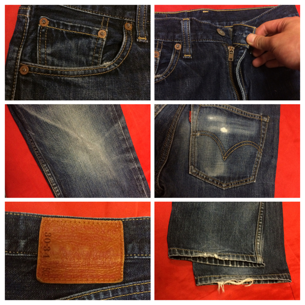 一般てしな使用感・色落ち感があり、両裾口と後ろポケットにダメージ、ポケット袋と左膝などに少し擦れが見られます。(画像でご確認下さいませ) 古着慣れされている方でしたらそれ程気にならない程度かと思いますが、神経質な方はご遠慮下さいませ。