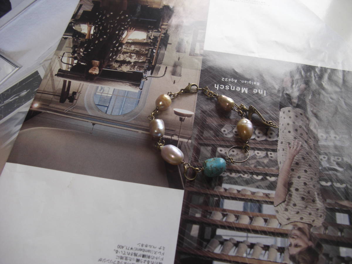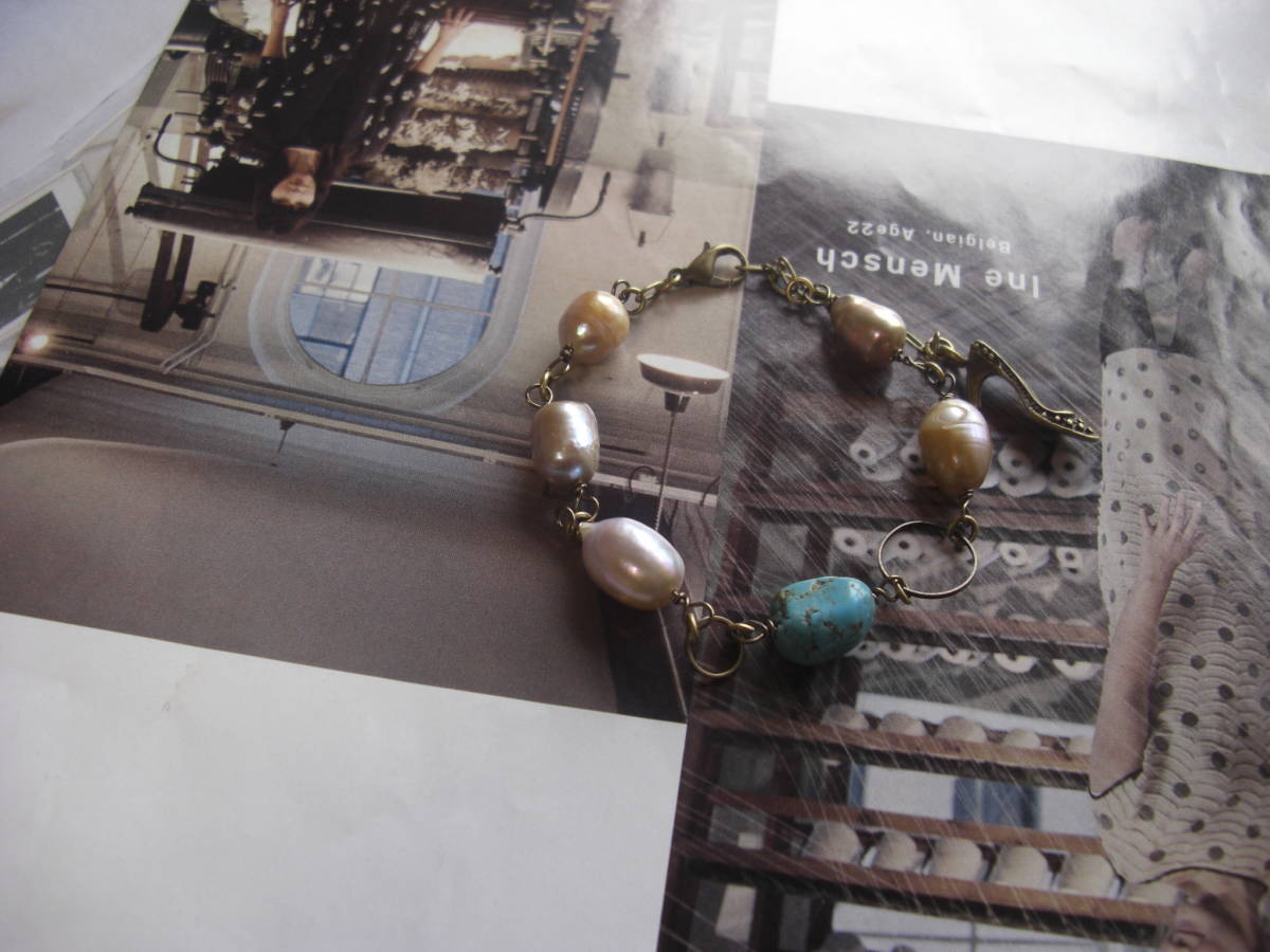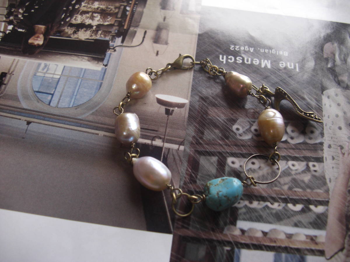 アリス・マニア・・シリーズです♪淡水パールとターコイズ・・ナチュラルカラーの淡水パールとターコイズを合わせてこれからの季節にぴったりのブレスレット です♪パールは表情豊かなバロックパールなのでシンプルなデザインに仕立てました♪♪8ミリから12ミリ位の大きさ違いのバロックパールに9ミリ×12 ミリ位のラフタンブルのターコイズを合わせました♪長さ は23センチ位で調節自由です♪お揃いのシリーズも出品しています♪ハンドメイドを ご理解頂いてノークレーム、ノーリターンでお願いします