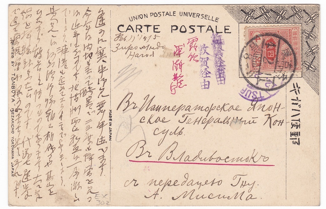 田沢大正白紙4銭貼外信はがき ロシア宛 櫛型印 名古屋/4.2.11/后8-9