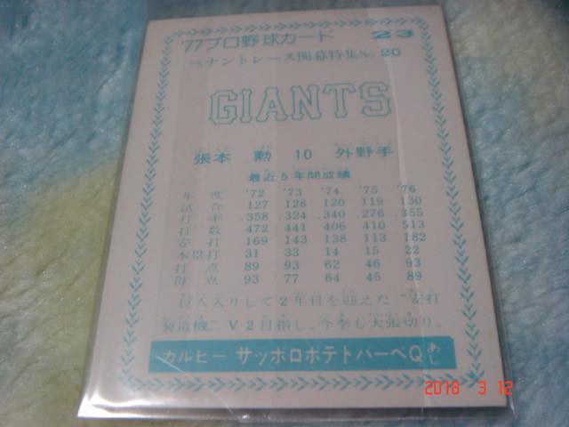 カルビー '77年 プロ野球カード 『'77ペナントレース開幕特集』NO.23(張本/巨人) 青版