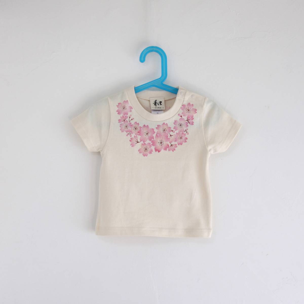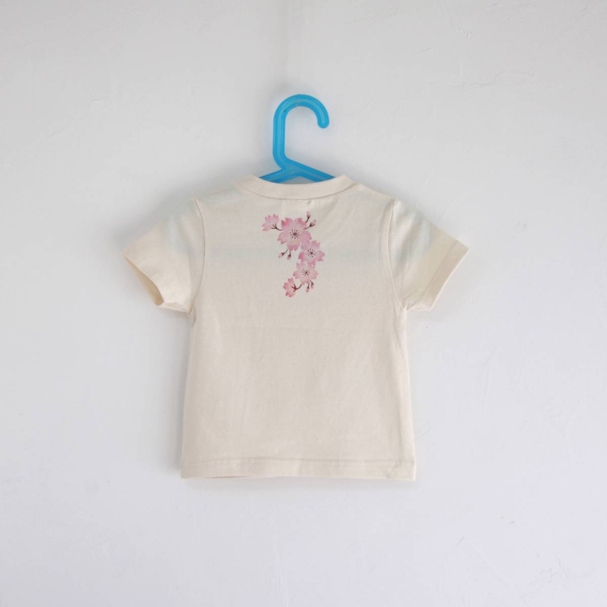 ご覧いただきありがとうございます。 一つ一つ丁寧に手描きで絵付けし、筆跡やカスレなどがプリントTシャツとは一味ちがう手描きならではの味わいとなっております。 背中の左肩から前の胸、右の裾に水彩画の様なタッチの大振りな桜の花をデザインし、金色で雌蕊をシンプルに描いています。 ふんわりとした優しい桜色の色合いは男の子女の子どちらにも合わせやすいTシャツです。 大人サイズも販売しています。 日本的な物や和柄が好きな方、誕生日プレゼントやちょっとしたギフトにもおすすめの一枚です。 カラー:ナチュラル サイズ:100 100:身丈40㎝ 身幅31㎝ 肩幅28㎝ 袖丈12㎝ 素材:綿100% Tシャツ素材について:5.6オンス 胴仕上げ 首リブはダブルステッチ しっかりふっくらとした生地のハイクオリティなTシャツ、繰り返しの洗濯にもよれないコシのあるリブはTシャツ好きさんには納得していただける素材のTシャツを使用しております。 その他別のボディカラーやレディースサイズ、キッズサイズ、長袖素材、名前入れなどにも対応できますのでお気軽にご相談下さい。 | |||