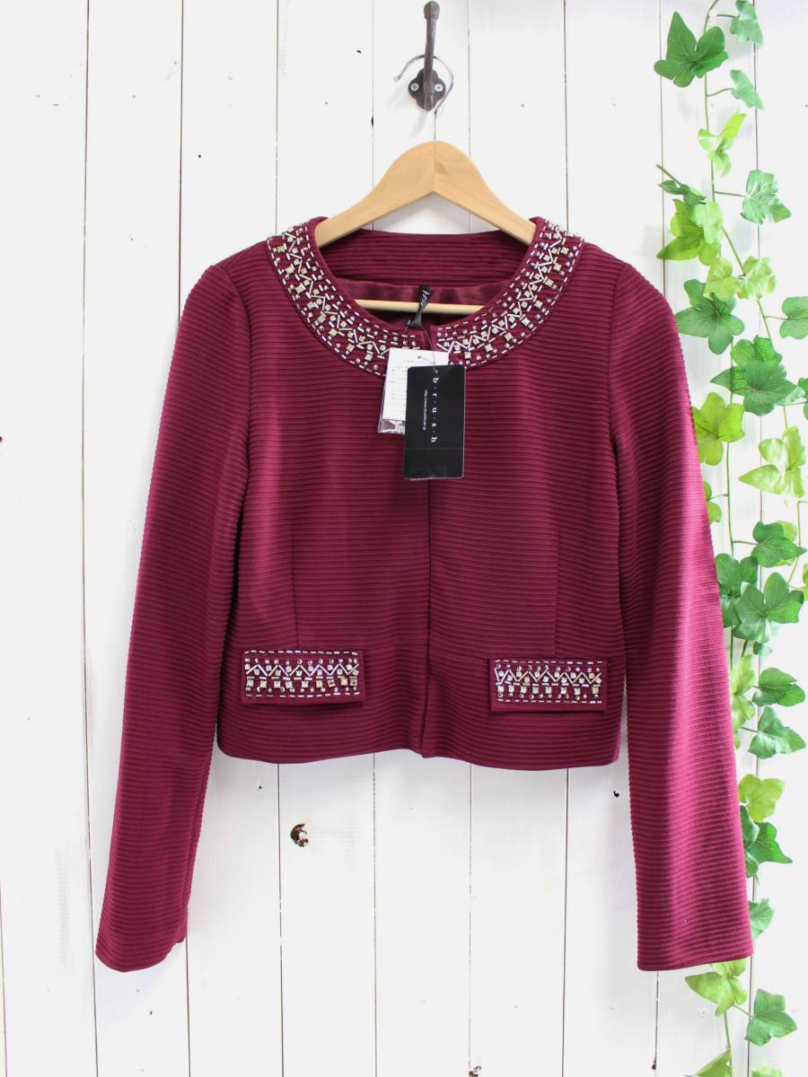 新品*b・r・u・s・h ブラッシュ brush*ビジュー装飾ノーカラージャケット(2)ワイン/定価8,900円【587-8675】
