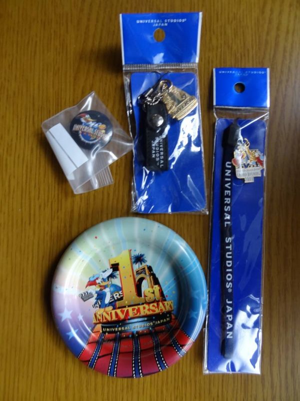ユニバーサルスタジオジャパン「2001年オープニング&1周年ストラップ&ブリキトレイ」「ウッドペッカー缶バッジ」 USJ 4点セット