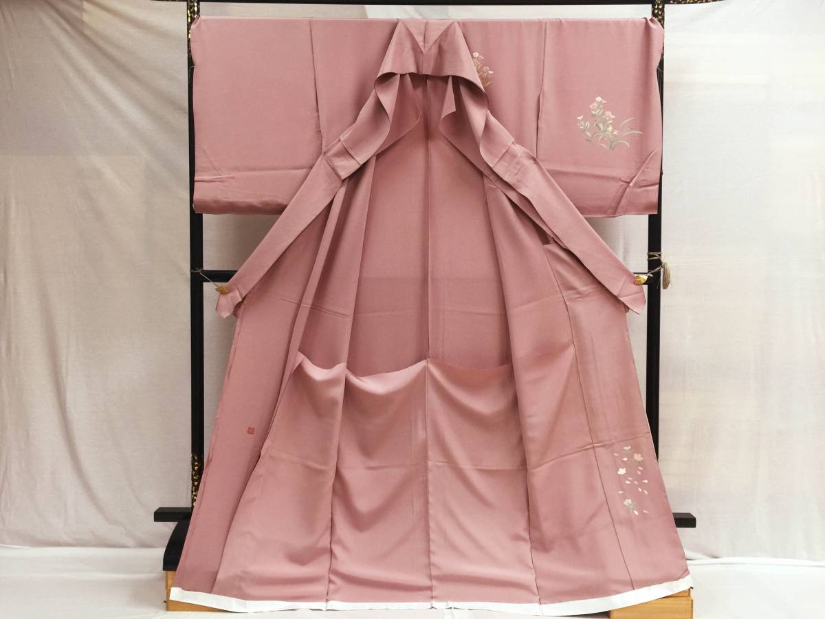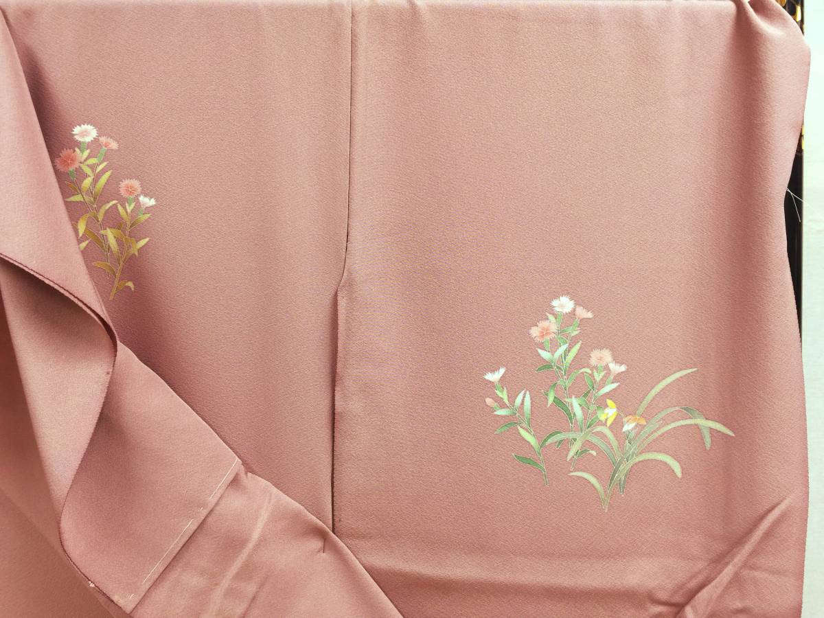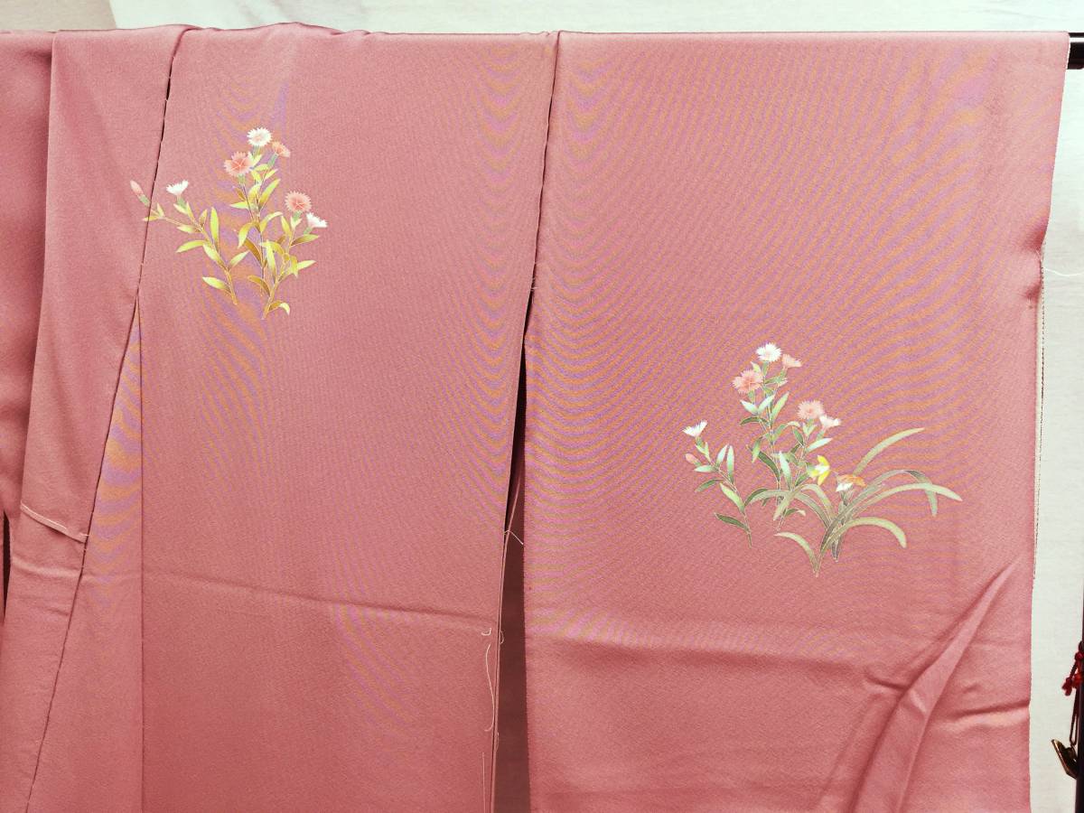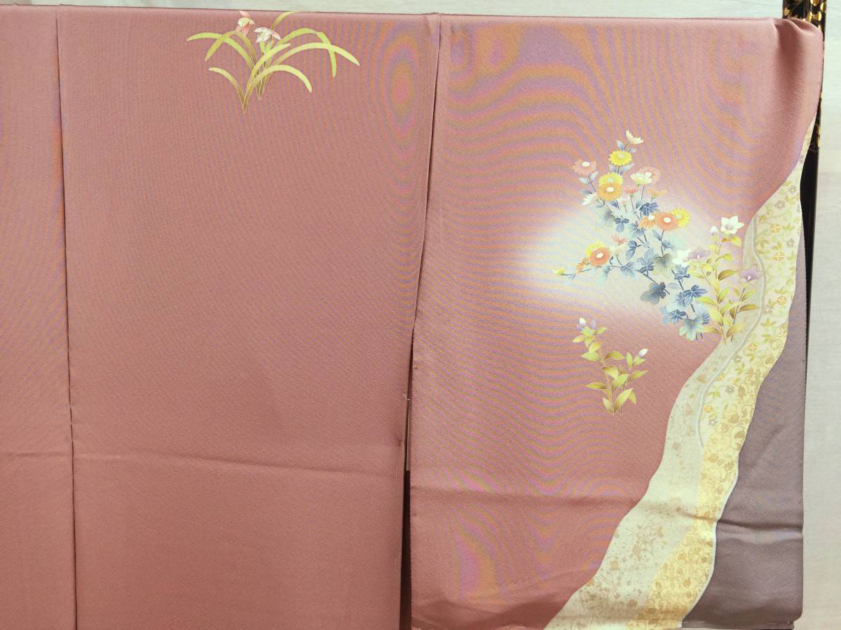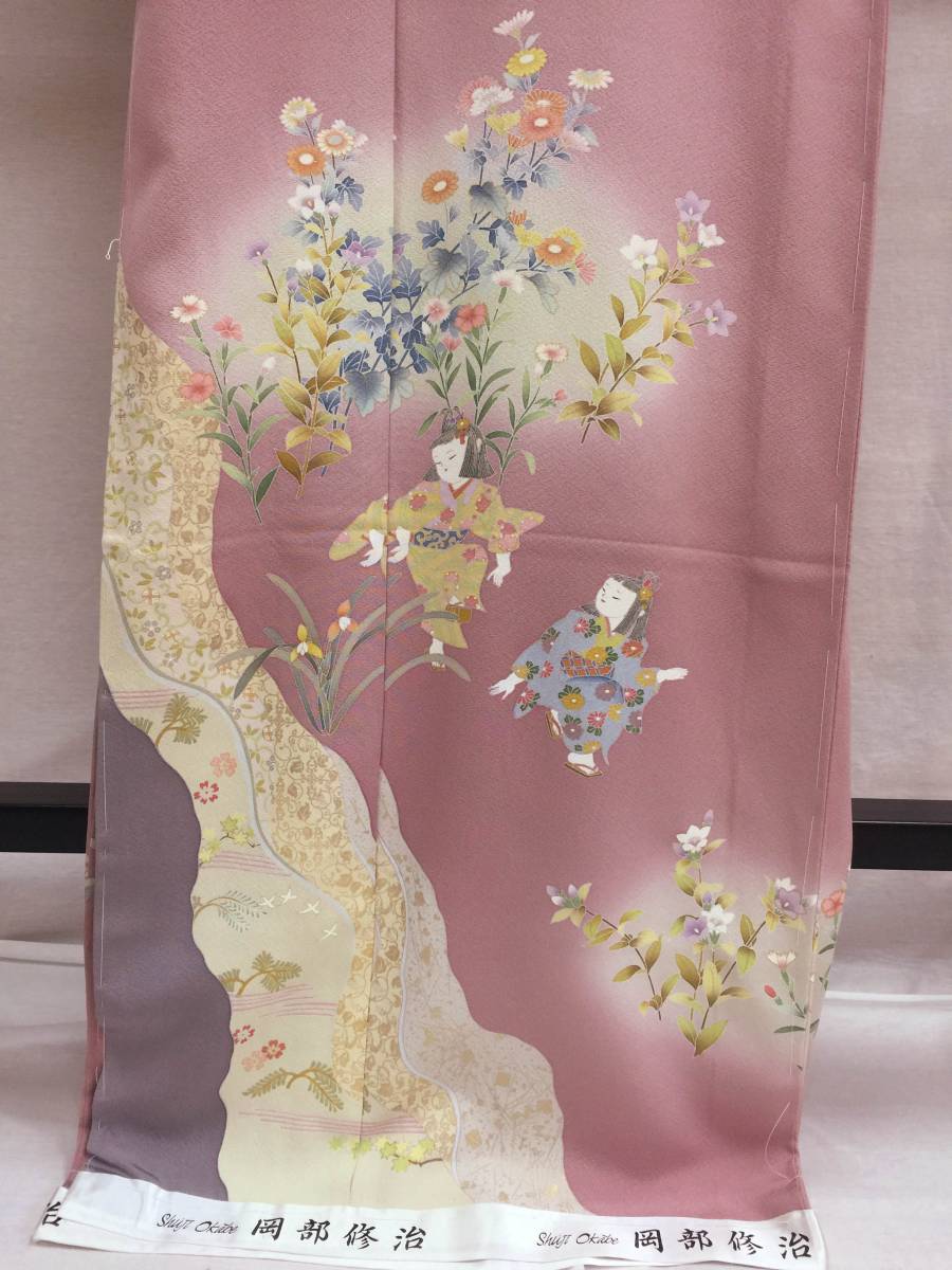 ピンクとグレーの中間調の地色に、四季折々の花々と吉祥文様の描かれた帯を締めた童子の戯れる図となっております。