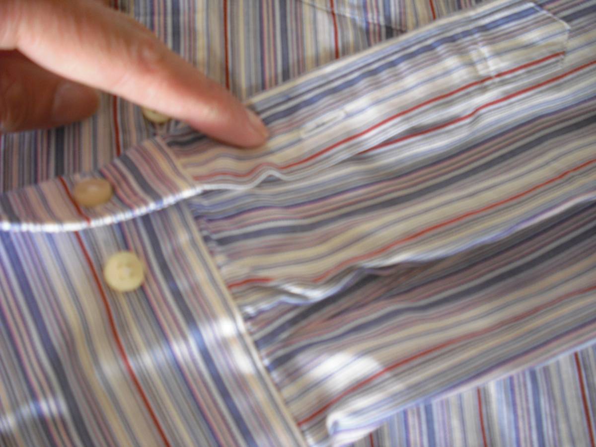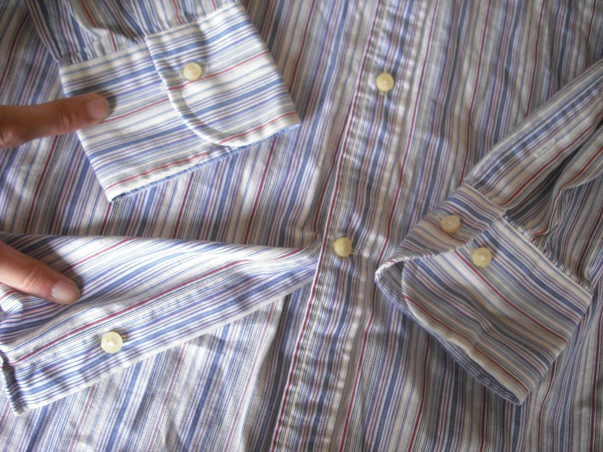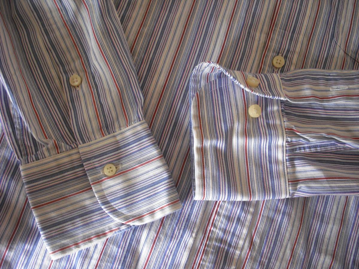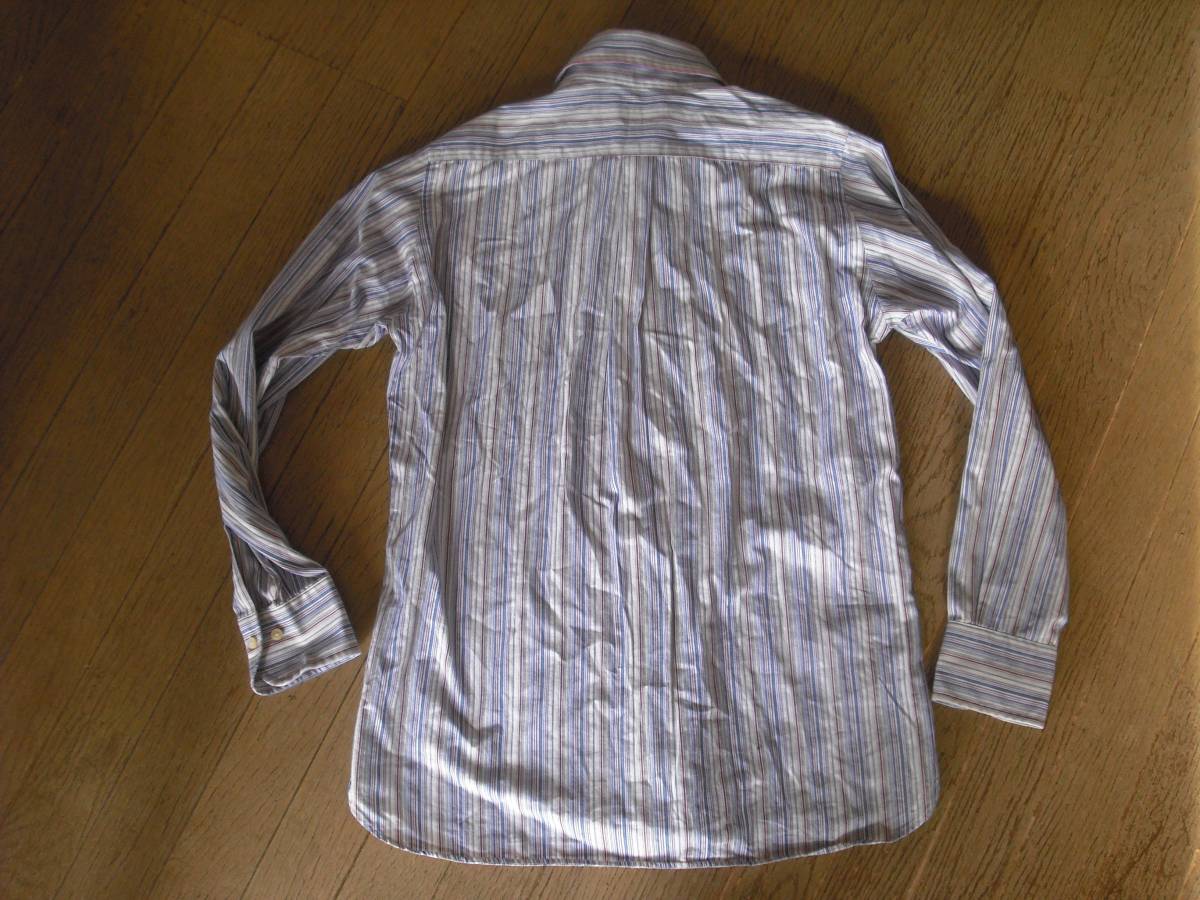 写真のようなカッターシャツになります。 前ボタン6個のデザインです。 サイズは3 綿100% (株)アバハウスインターナショナル 日本製 おおまかですが・・・着丈73cm、身幅50cm、袖丈61cmくらいです。 写真の状態でメジャーで測っています。 私見ですが…お色はホワイトっぽい地にブラウン、ピンク、イエロー、ネイビーっぽい線模様です。 袖ボタンの紛失あり。 本来2個ある部分が1個、袖上部のボタン1個紛失あり。 予備ボタンは前ボタンの大きさです。 保管中の汚れ、畳みジワ、経年劣化、他商品と触れあっているため糸クズの付着などございますし、中古であり、個人所有になりますので糸のほつれ、汚れやスレなどの痛みがある場合もございます。 現状でよろしくお願いします。 約230g 簡易包装の定形外郵便250gかレターパックライトで発送予定です。 |