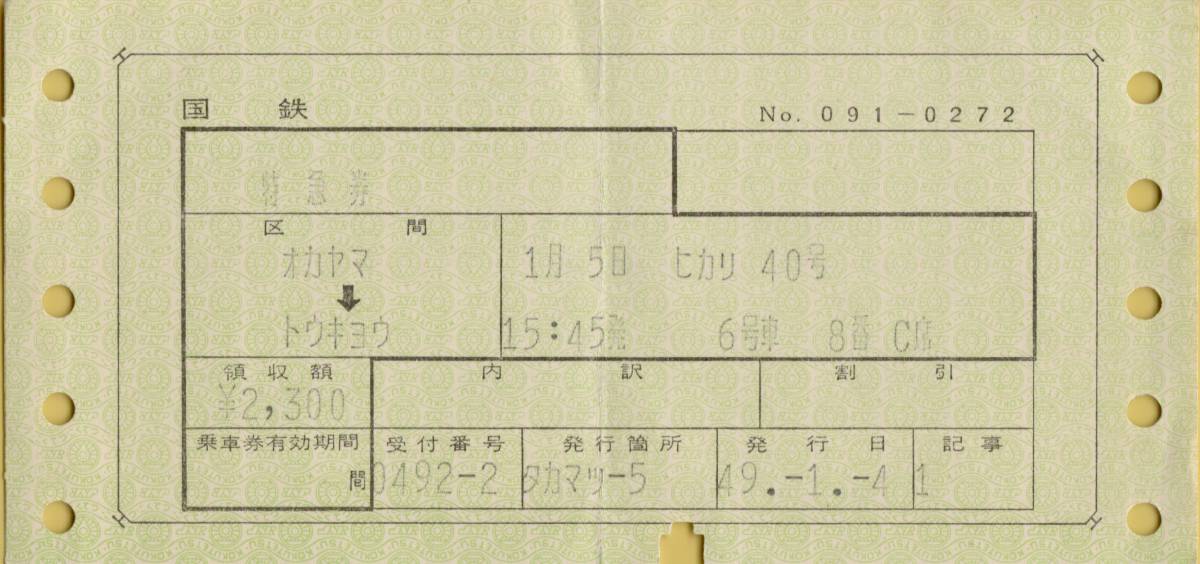 ひかり40号 【 マルス(横) 】S49.-1.-5   オカヤマ→トウキョウ ◆タカマツー5 (S49.-1.-4) 発行