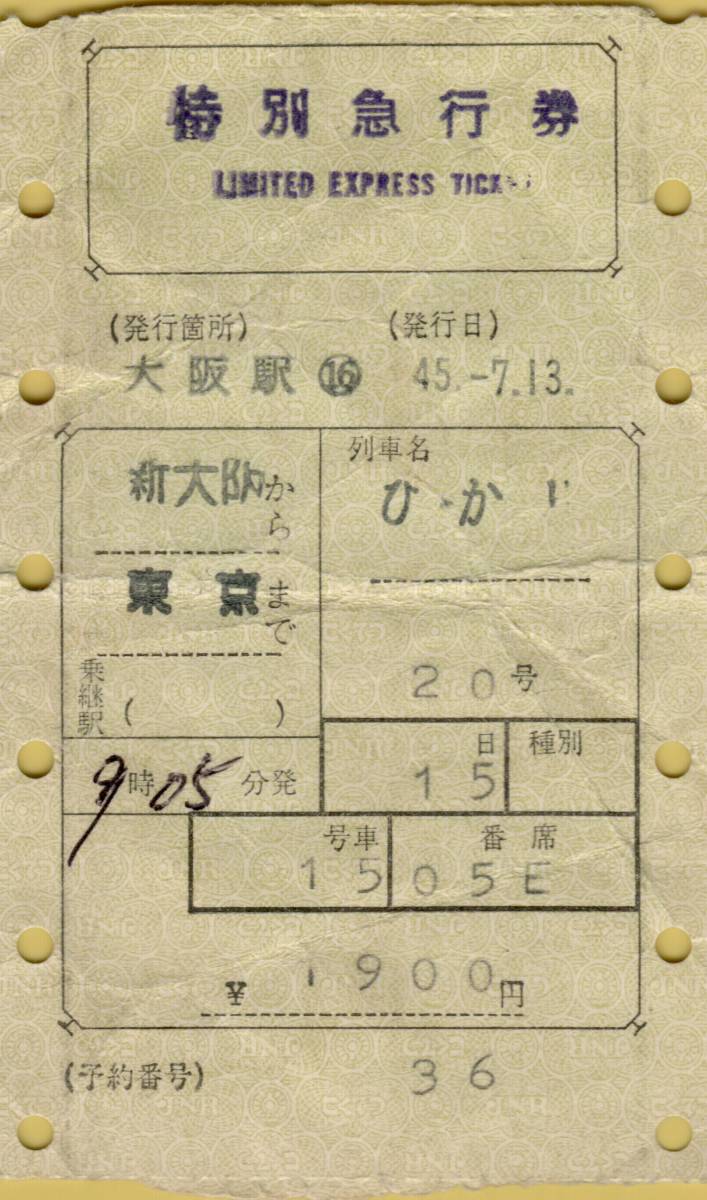 ひかり20号 【 マルス(縦) 】S45.-7.15  新大阪→東京  ◆大阪駅発行 (S45.-7.13)