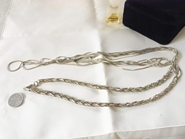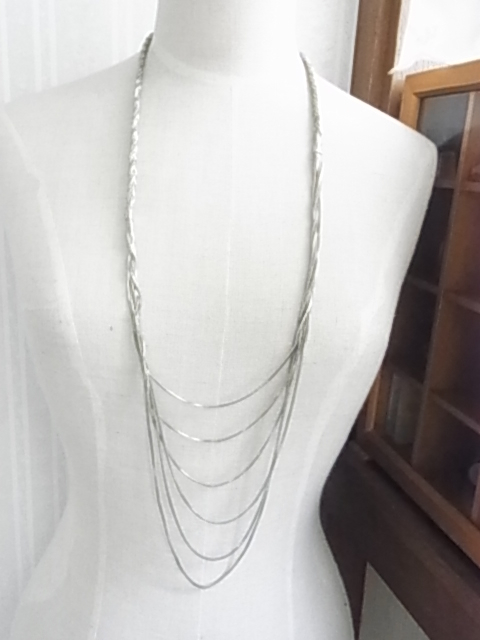 ●シルバーカラー 銀色 編込みチェーンと6連チェーンのコンビデザイン エレガントなロングネックレス
