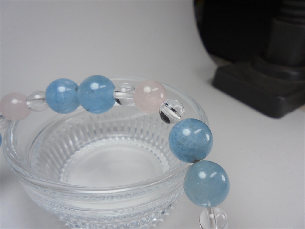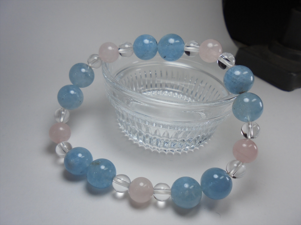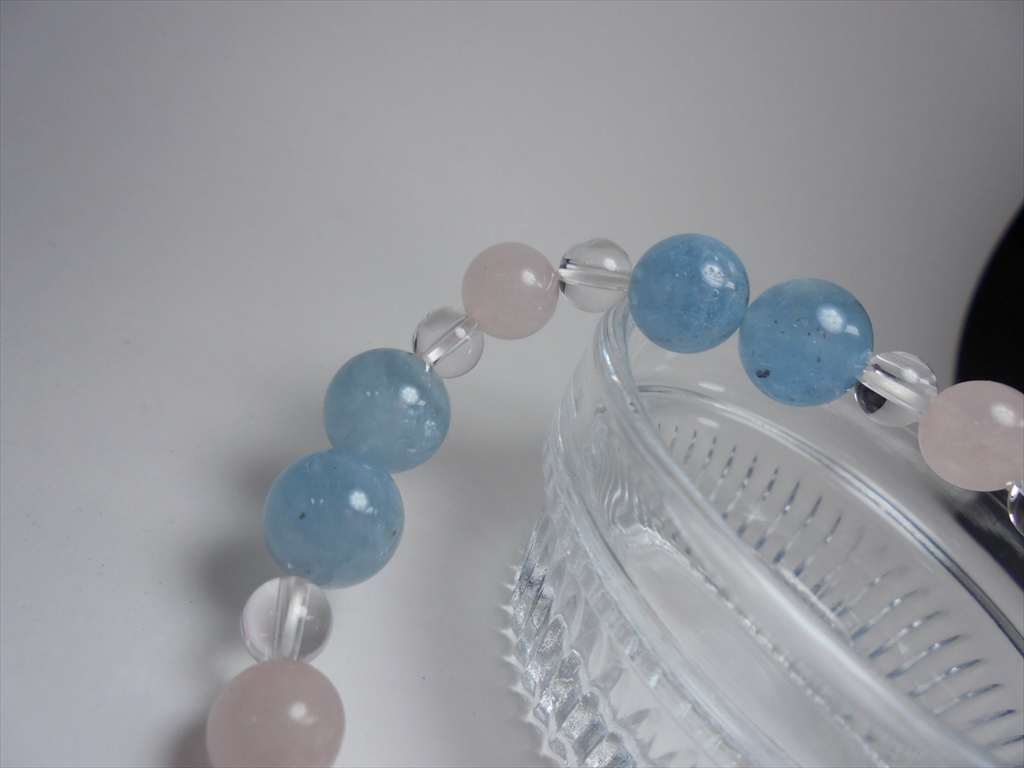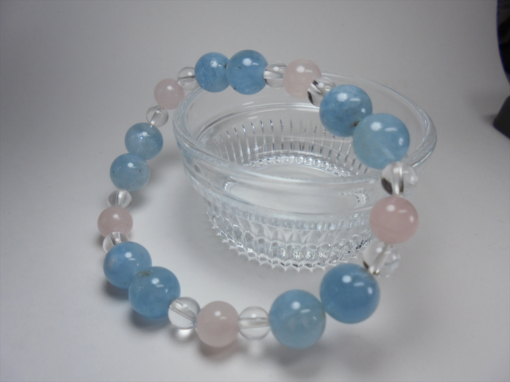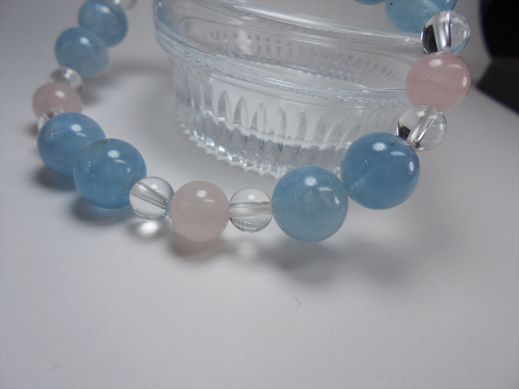 | 大きめ-喜心-アクアマリン4A10mm-ローズクォーツ8mm-水晶5A6mm-内径15.5cm-天然石ブレスレット | |||