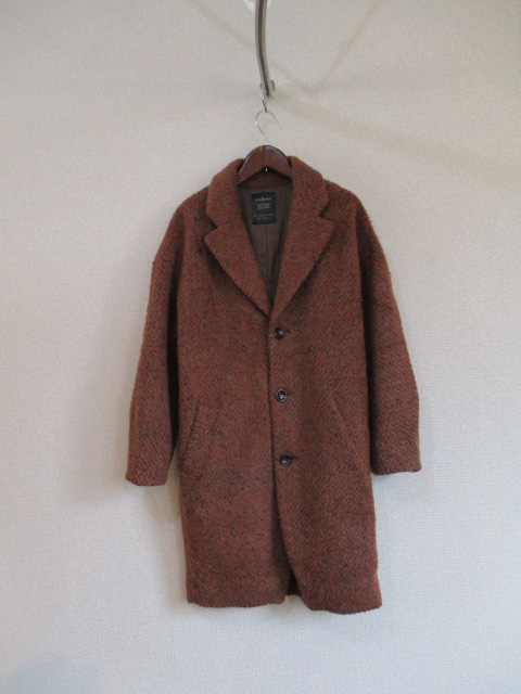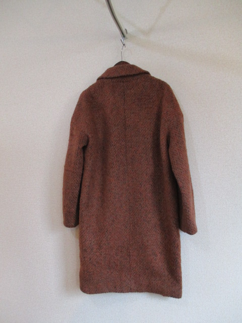 | 商品紹介 | 開襟・シングルボタンのチェスターコートです。 裾はややすぼまった形で、前合わせの裾が少しハの字に開いています。 色はオレンジや茶系の色が混ざったミックスブラウン系です。 元々、起毛した素材です。 《素材》 表地:ポリエステル55% アクリル25% 毛20% 裏地:ポリエステル100% |