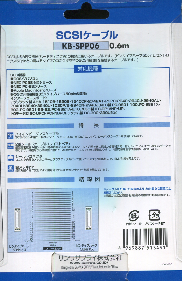 | 商品説明 | サンワサプライ株式会社 KB-SPP06 ●ハイインピーダンス、二重シールドケーブル ●二重構造、シールドコネクタ ●金メッキピン使用 ●SCSI、SCSI-1(Fast SCSI)、SCSI-3(Ultra SCSI)対応 コネクタ:両端D-sub50ピン・ハイピッチ(オス) ケーブル長:0.6m 定価:4,400円 |