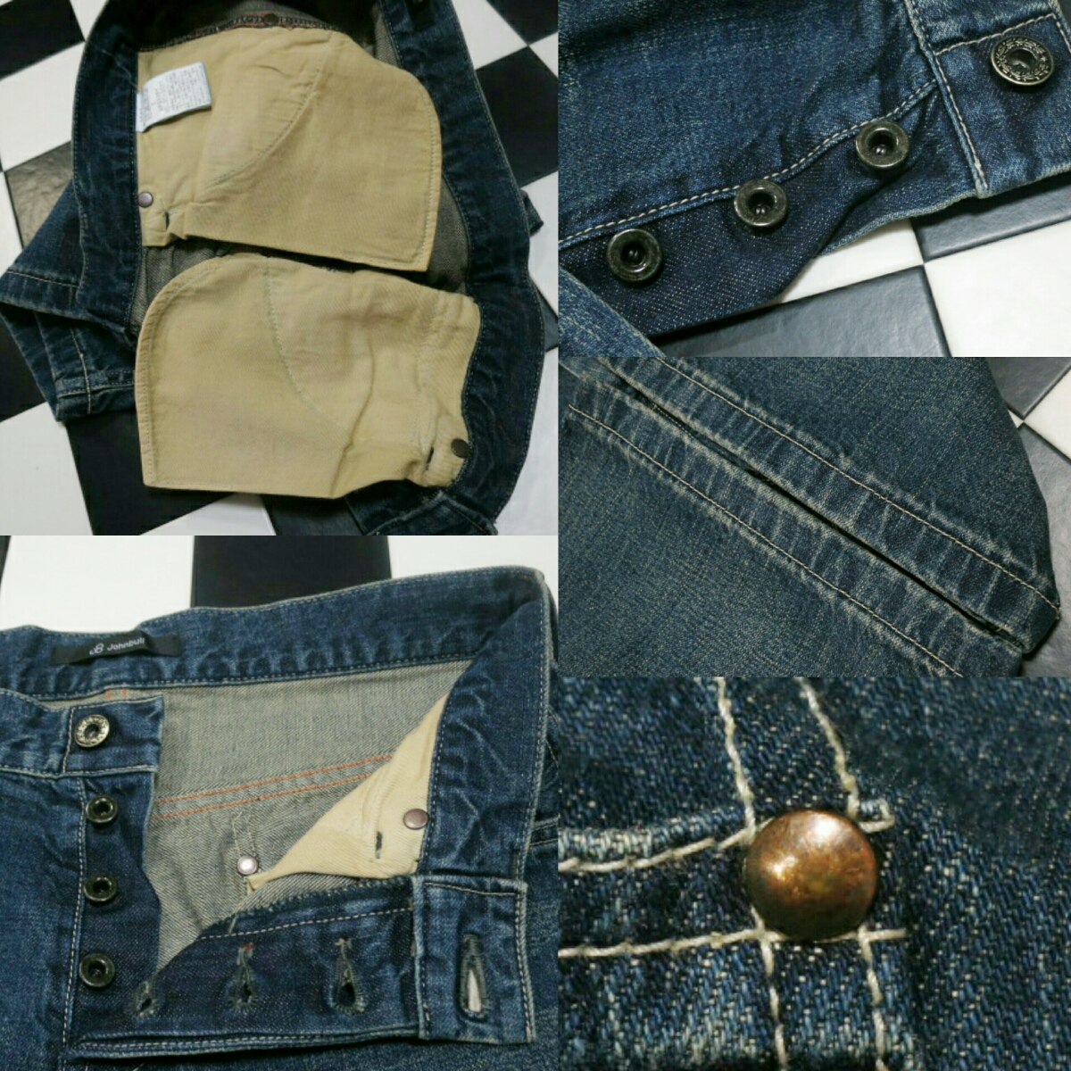 ・状態は裾のスレと色落ち、裾上のスレと色落ち、、サイドシームのスレと色落ち、ポケットふち部分のスレと色落ち、、金属部分の腐食、ポケットインナーの薬品汚れ、生地の厚くなった部分のスレと色落ち、その他デニム生地特有のスレと色落ちがございます