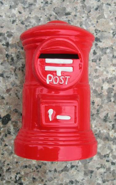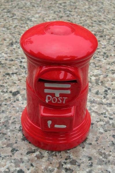 赤ポストの貯金箱です。サイズは、高さ約11cm×底面直径約6.8cm