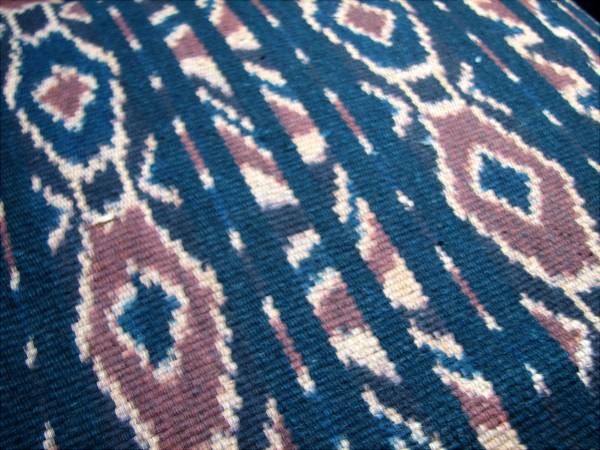 写真のイカットは、第8位の作品。テルナテ島ウマプラ村のラヒマ・トヌ(Rahima Tonu)さん(17歳)の作品です。テーマは地元で「Tanapi Fadang」と呼ばれるモチーフです。このサルン(腰巻)は筒型で、サイズは約81 X 123cm。総自然素材ですので、巻きスカートやタペストリーに最適でしょう。あるいはつなぎ目を解いてソファーカバーなどにも応用できます。