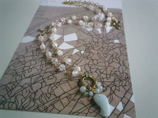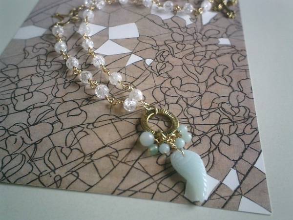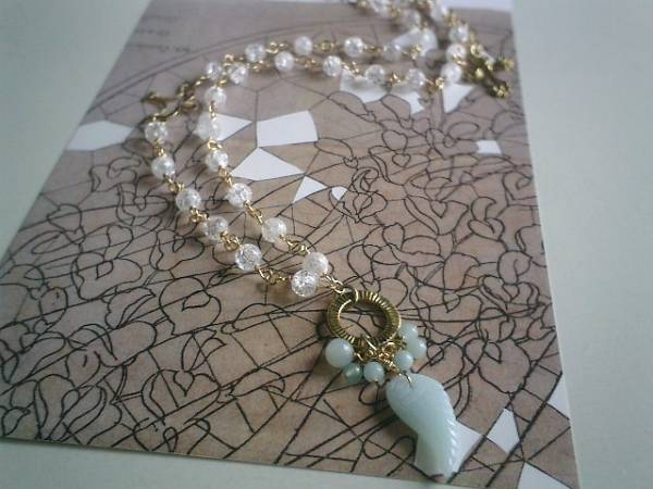 セシル・スタイル・・シリーズです♪永遠の水色・・神秘的なクラッククリスタルとアマゾナイトのネックレスです♪小鳥さんの透かしチャームやトップにアマゾナイトの羽根を合わせてファンタジーな表情です♪クラッククリスタルは6ミリの丸玉、アマゾナイトは4ミリ、6ミリの丸玉です♪長さは全長77センチ位で調節自由です♪トップは5・5センチ位です♪お揃いのブレスレットも出品しています♪シンプルで飽きのこないいつまでも着けられるデザインを考えて作りました♪ハンドメイドをご理解頂いてノークレーム、ノーリターンでお願いします