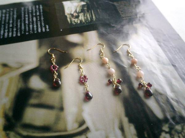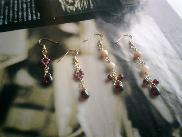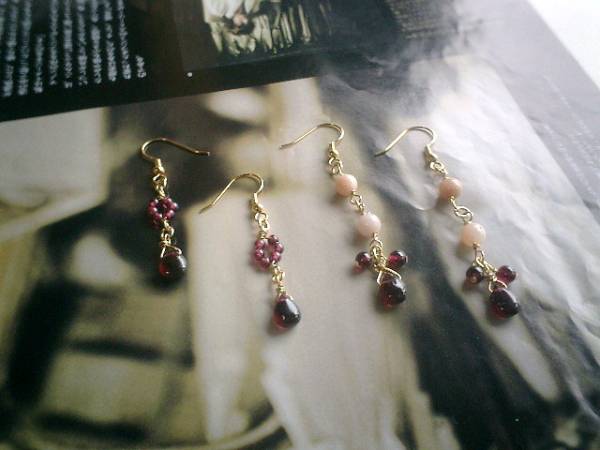 エスニック・気分・・シリーズです♪春の色を集めて・・ふんわりやさしいピンクオパールのピアスです♪デザイン違いのペア2組です♪深い赤のガーネットを合わせて可憐な表情です♪オパールは6ミリの丸玉、ガーネットは3ミリから9ミリ位までの丸玉、チューブ、ドロップなどデザイン違いです♪長さは左側のペアが全長5センチ、右側のペアが全長7センチ位です♪イヤリングにも変更出来ます♪お揃いのネックレスやブレスレットも出品しています♪シンプルで飽きのこないいつまでも着けられるデザインを考えて作りました!ハンドメイドをご理解頂いてノークレーム、ノーリターンでお願いします