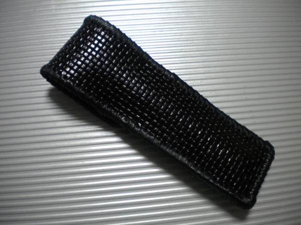 表面の蓋から、後ろ側にかけては、編み込みデザインを型押したブラックレザーを使用しています。