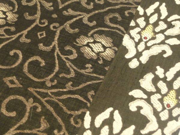 黒地に薄茶色・グレー・白・黄色・赤などで、唐花文柄が織られています。