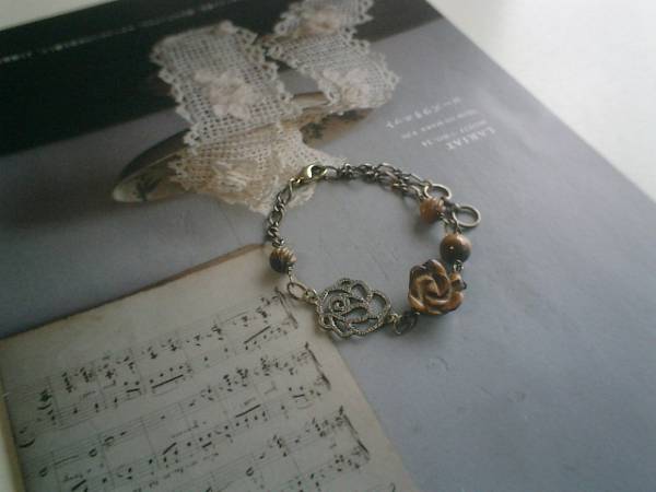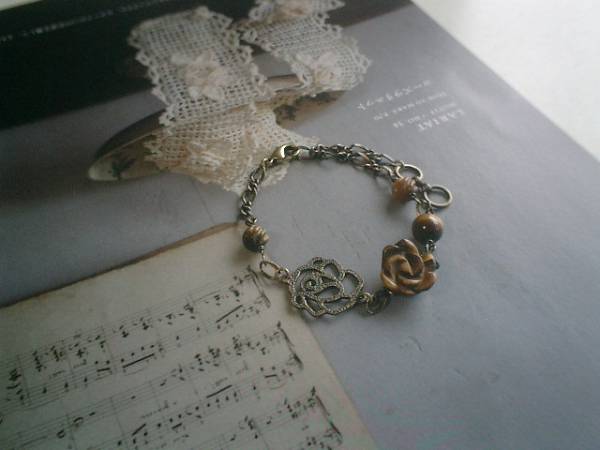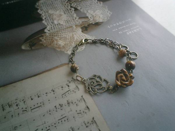 ロゼッタの宝石箱・・シリーズです♪主役の薔薇・・シックなタイガーアイのブレスレットです!タイガーアイは8ミリの丸玉、6ミリのSラインに15ミリ位の薔薇です♪薔薇のメタルチャームを合わせて大人のロマンチックしています♪♪長さは全長23センチ位で調節自由です♪お揃いのネックレスも出品しています♪シンプルで飽きのこないいつまでも着けられるデザインを考えて作りました!ハンドメイドをご理解頂いてノークレーム、ノーリターンでお願いします