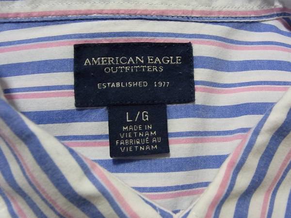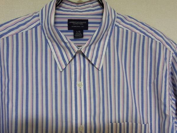 即決!USA古着●AEアメリカンイーグルストライプデザインシャツL!アメカジレア!アメリカで買ってきましたカジュアルブランドとして有名なアメリカンイーグルのストライプ長袖シャツです。カラーは写真を参考にして下さい。表記サイズLで着丈(後ろ)約80cm、身幅約61cmです。素人採寸ですので多少の誤差はご了承お願い致します。状態は古着ですので、ある程度の着用感あります。特別目立つキズ、よごれはありませんが、あくまで古着として考えてください。古着にご理解のある方の入札お願いします。定形外郵便または、ゆうパック着払いでの発送になります。他にもいろいろ出品しています。よろしくお願いします。